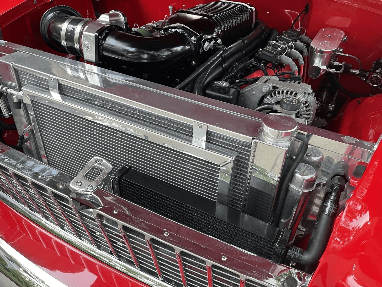 An aluminum radiator and intercooler is mounted in front of a 6.2-liter LSX376-B15 V8 crate engine topped with a Whipple 2.9-liter supercharger that was installed.