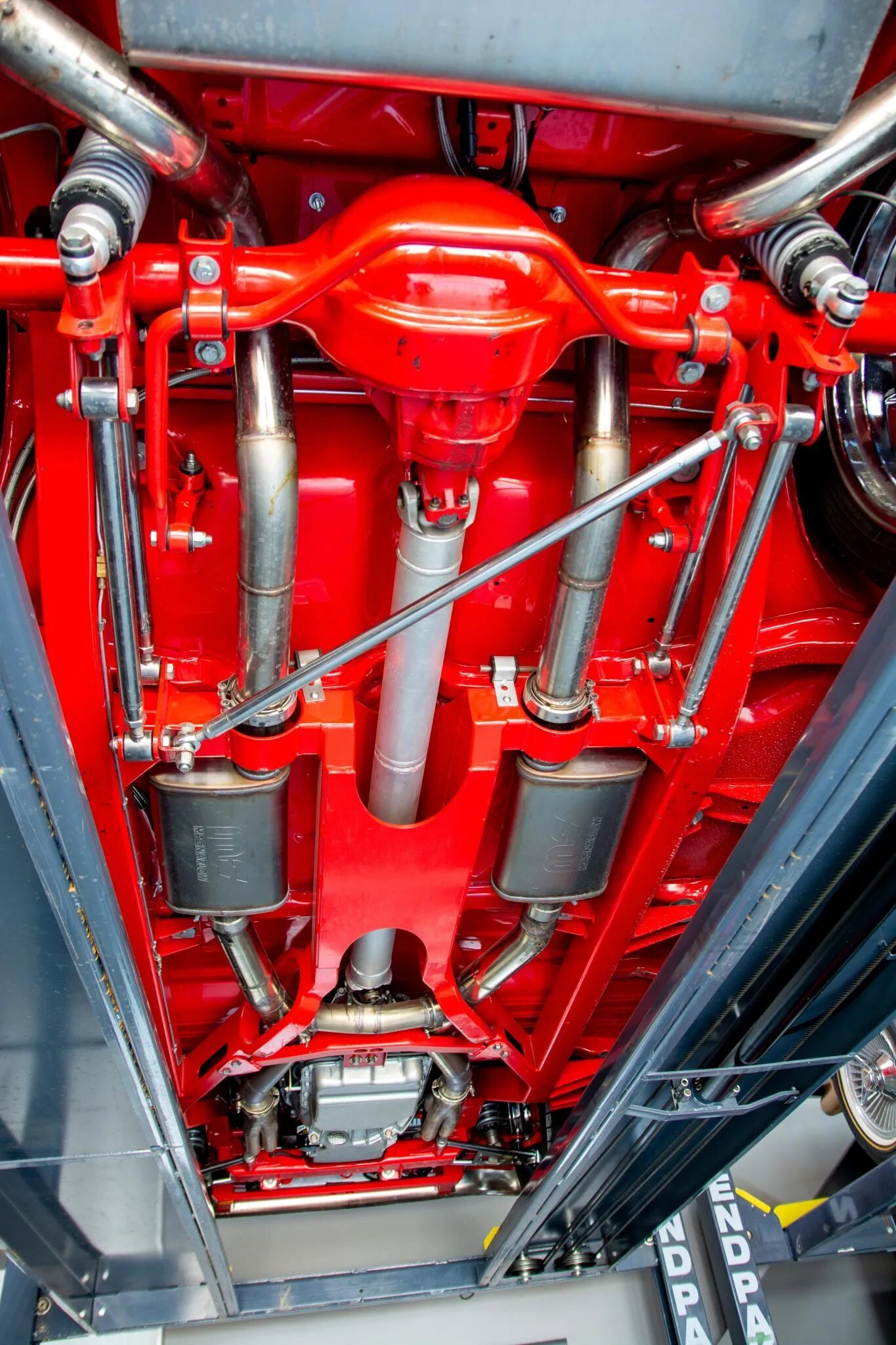 Power is sent to the rear wheels through a GM 4L75-E four-speed automatic transmission with a SuperMatic controller as well as a red-finished 9″ Ford rear axle with a 3.70:1 gear ratio.