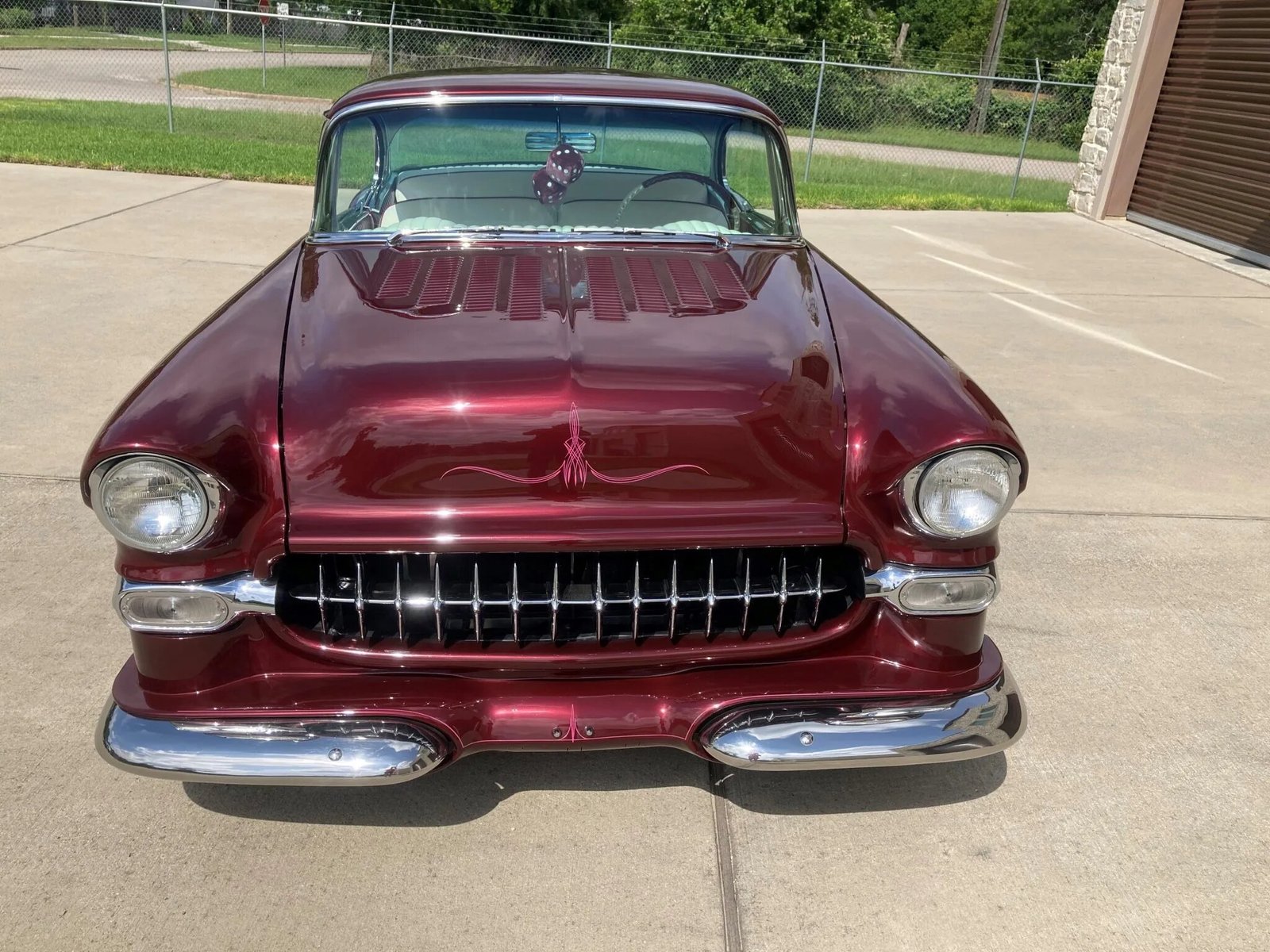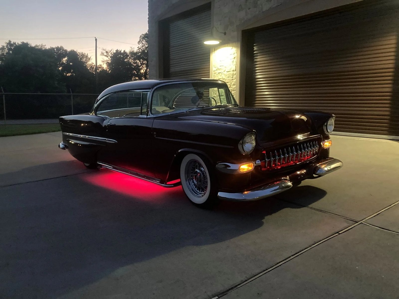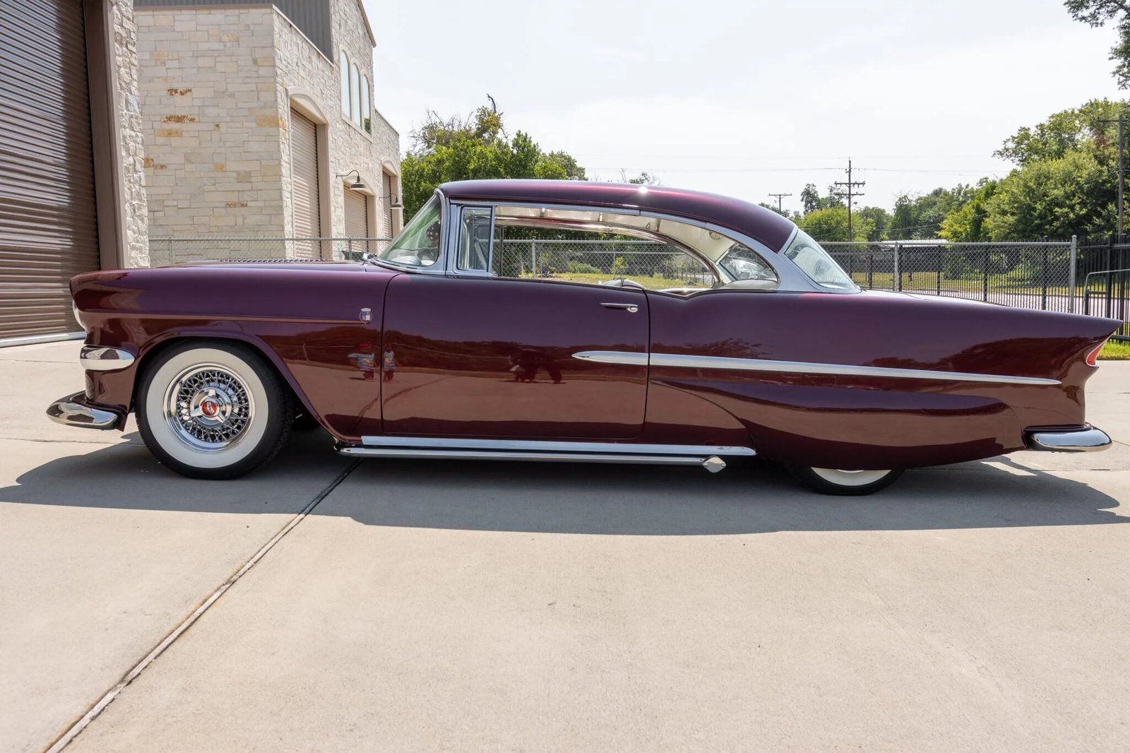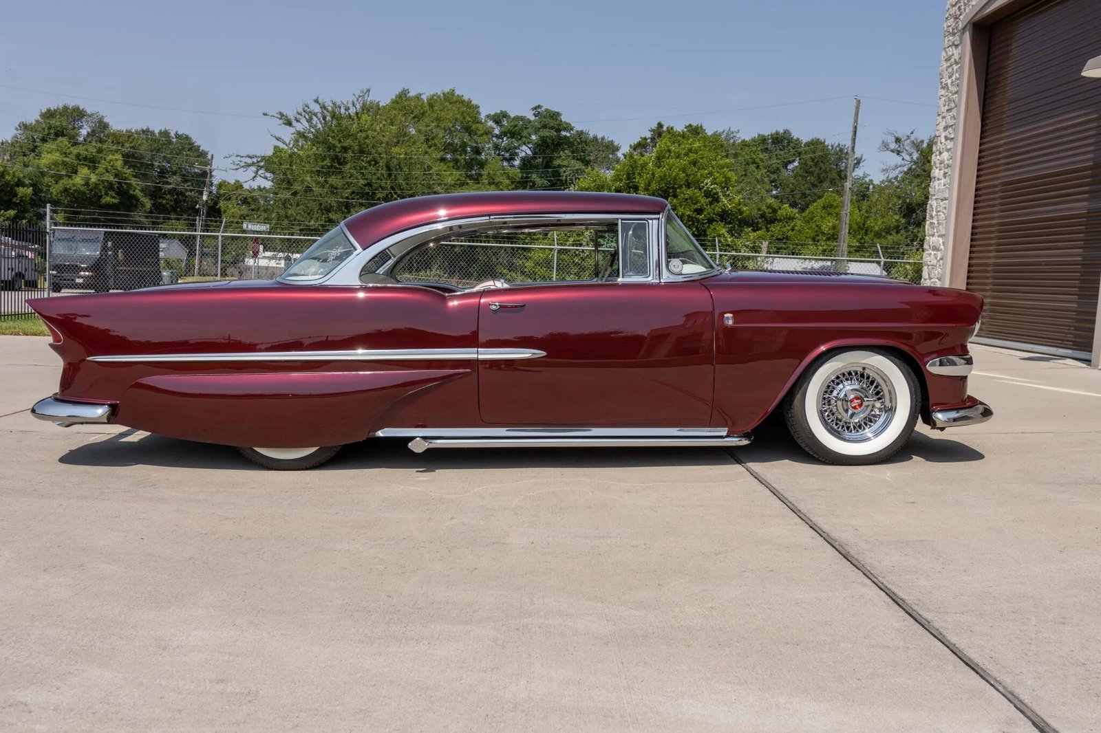 Modifications include a trio of two-barrel carburetors, a louvered hood, a 1955 Corvette grille, Packard taillamps, Pontiac front and rear bumpers, metal bubble-style rear fender skirts, Barris Kustom badging, a custom trunk-mounted fuel filler, underbody lighting, a 1958 Chevy Impala steering wheel, and painted pinstripes as well as etched mirror and rear window glass, functional lake pipes with electric cut-outs, chrome wire wheels, front disc brakes, Coker wide whitewall tires, a retro-style digital stereo, and an electric antenna and door and trunk poppers.