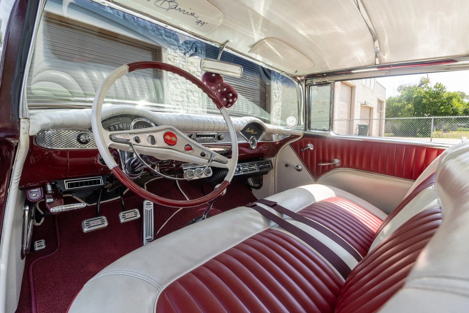 The trunk is upholstered in white and burgundy vinyl that matches the interior, and the left sun visor is signed by George Barris.