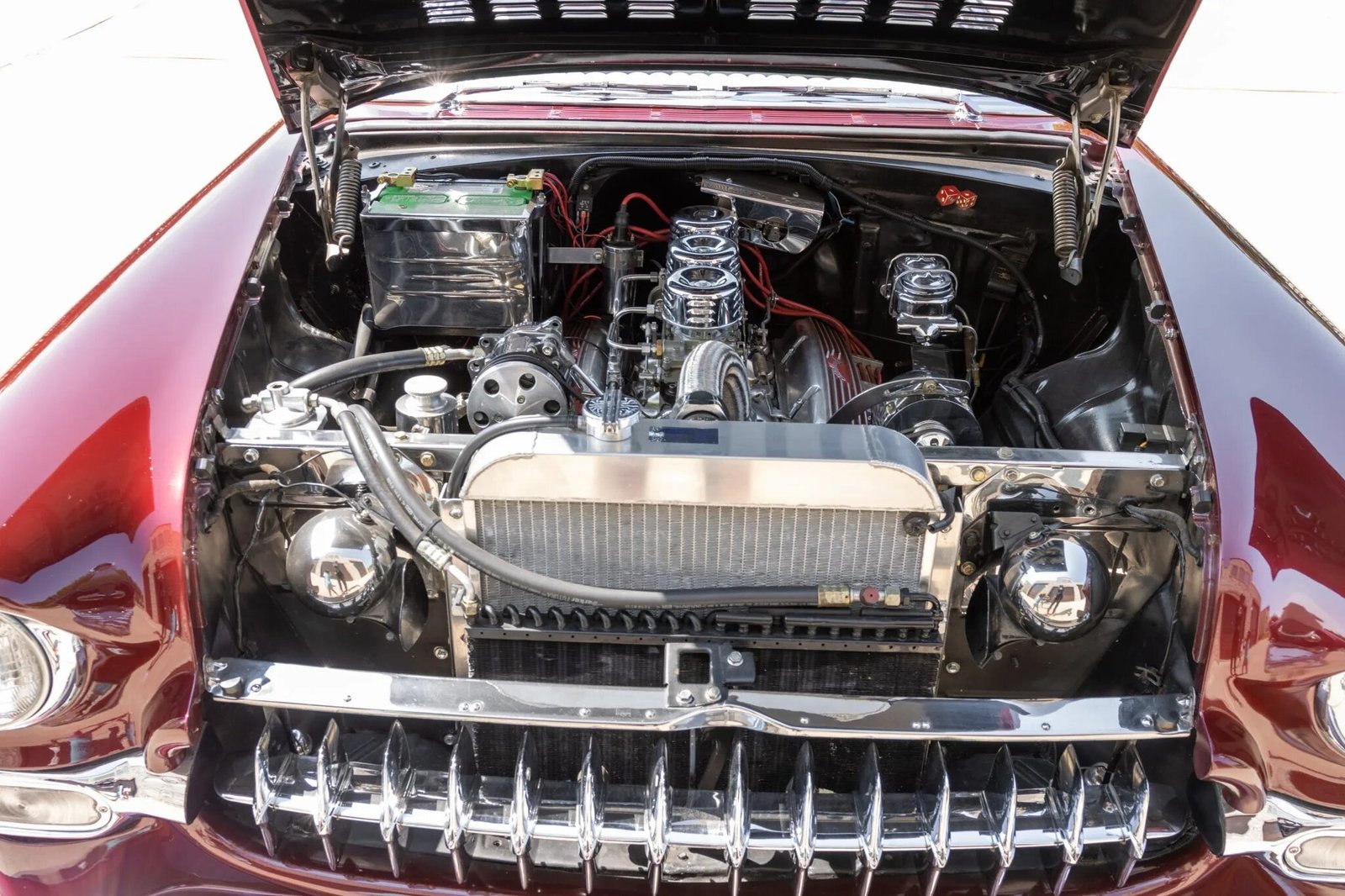 Body modifications consist of a louvered hood, 1954 Chevrolet parking lamps, a 1955 Corvette grille, Packard taillamps, Pontiac front and rear bumpers, bubble-style rear fender skirts, painted pinstripes, Barris Kustom badging, etched mirror and rear window glass, a recessed electric antenna, underbody lighting, and functional lake pipes.