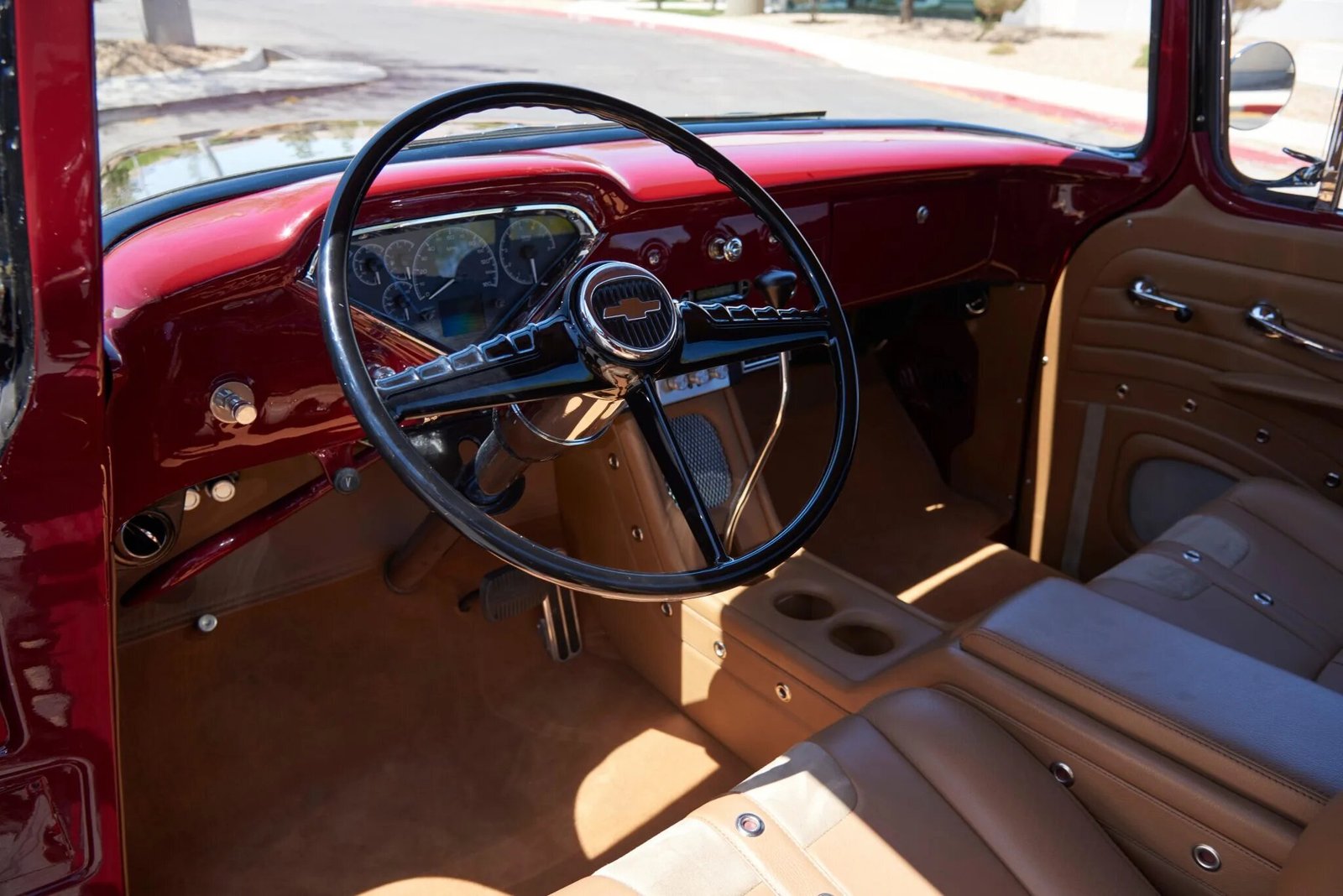 The cabin features bucket seats upholstered in tan leather with a matching center console, door panels, and headliner.