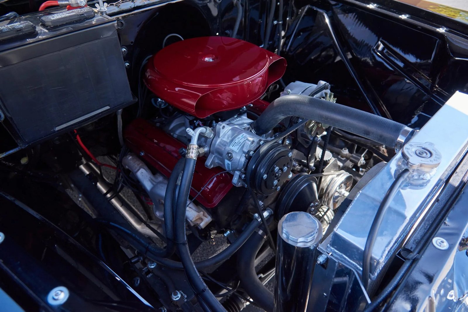 An aftermarket camshaft and a four-barrel carburetor have been installed as well as an aluminum radiator and a red air cleaner housing and valve covers.
