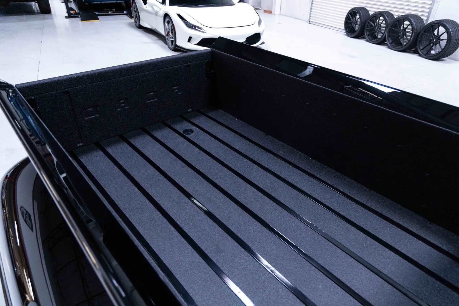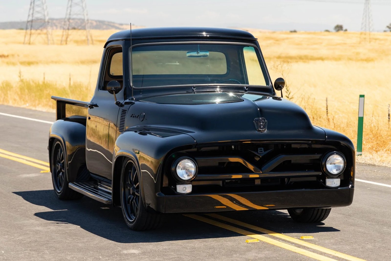 The body was repainted black during the body-off refurbishment, and the cargo bed floor has been coated with bedliner material and fitted with body-color runners. Equipment includes a shaved front bumper, a rear roll pan, running boards, and black Ford F-100 badging. The grille, bed runners, emblems, dual mirrors, door handles, headlight and running light trim rings are powder-coated in black. The fuel filler has been relocated to the cargo bed. A wiper motor is installed and the arms have been removed.