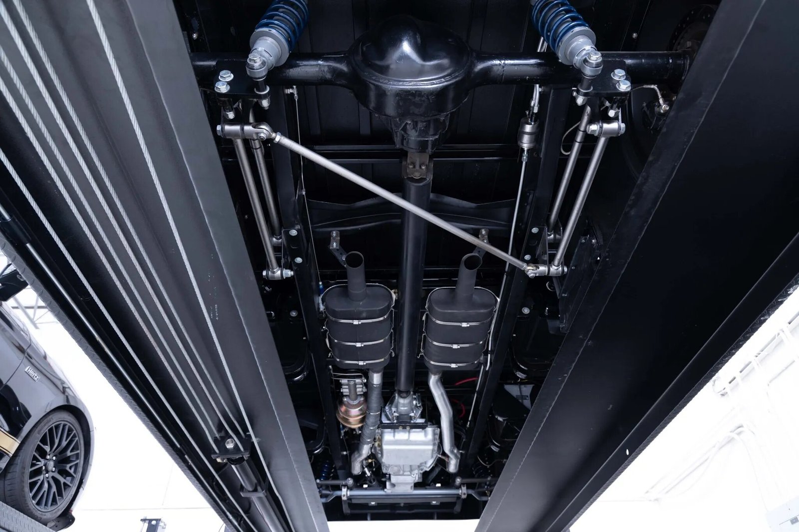 The black 20″ alloy wheels wear 255/40 Toyo Proxes Sport tires. Stopping power is from four-wheel disc brakes with drilled rotors and front Wilwood six-piston calipers. Modifications include rack-and-pinion power steering, a TCI Mustang II-style independent front suspension system, and a TCI four-link rear suspension setup with coilovers.