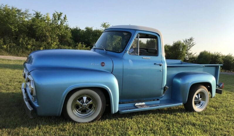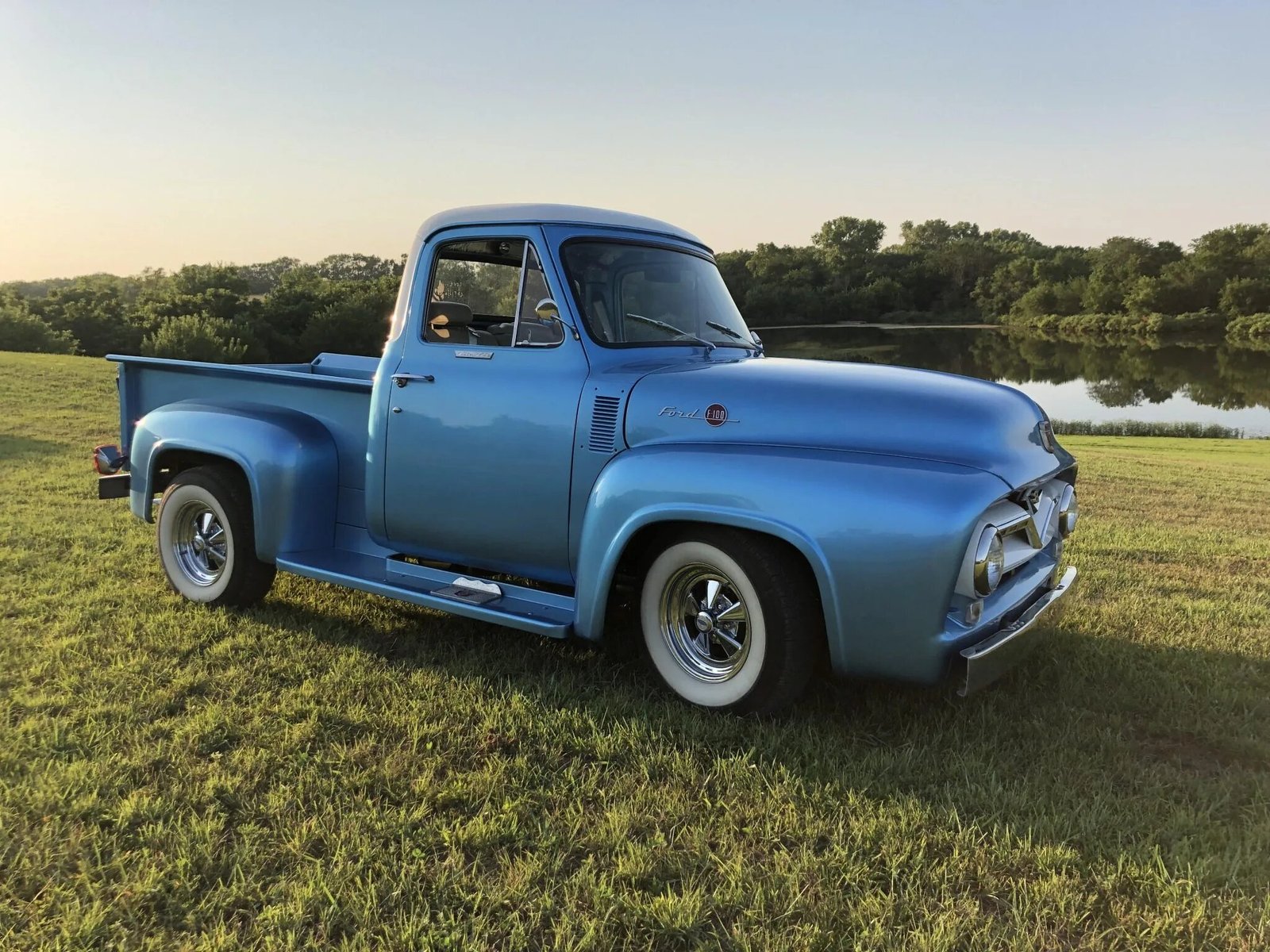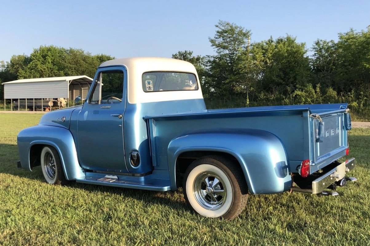 The cabin houses a bench seat sourced from a later-model vehicle upholstered in beige leather, while blue carpets are covered by Ford-branded rubber mats.