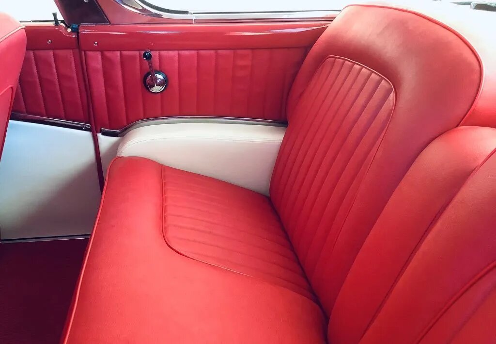 The front and rear bench seats are upholstered in red and are joined by red carpets along with a red and white dashboard and door panels.