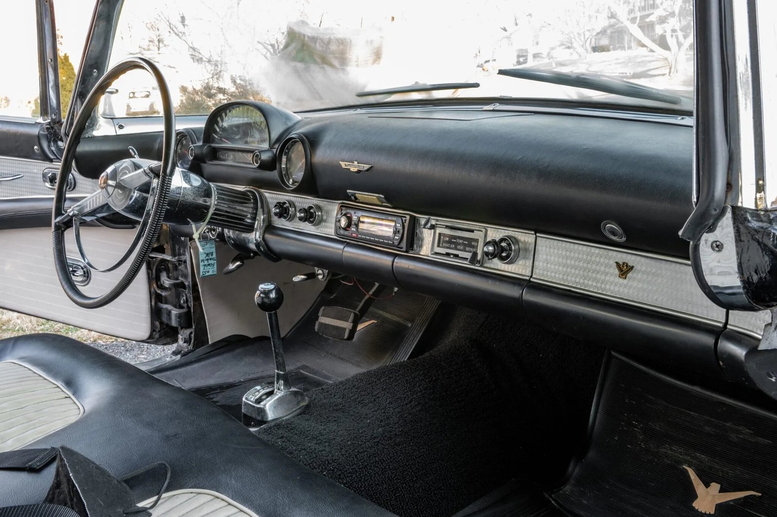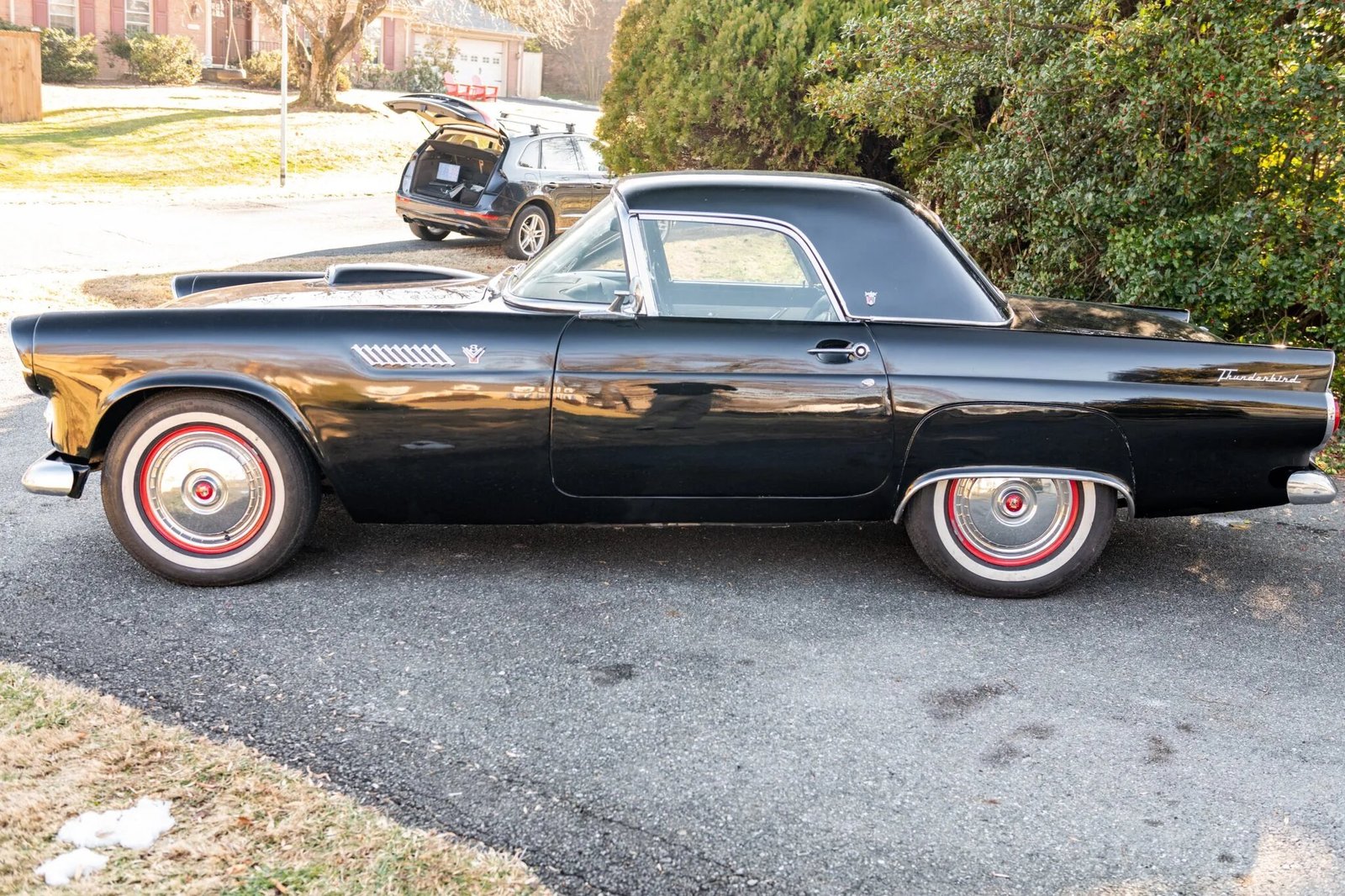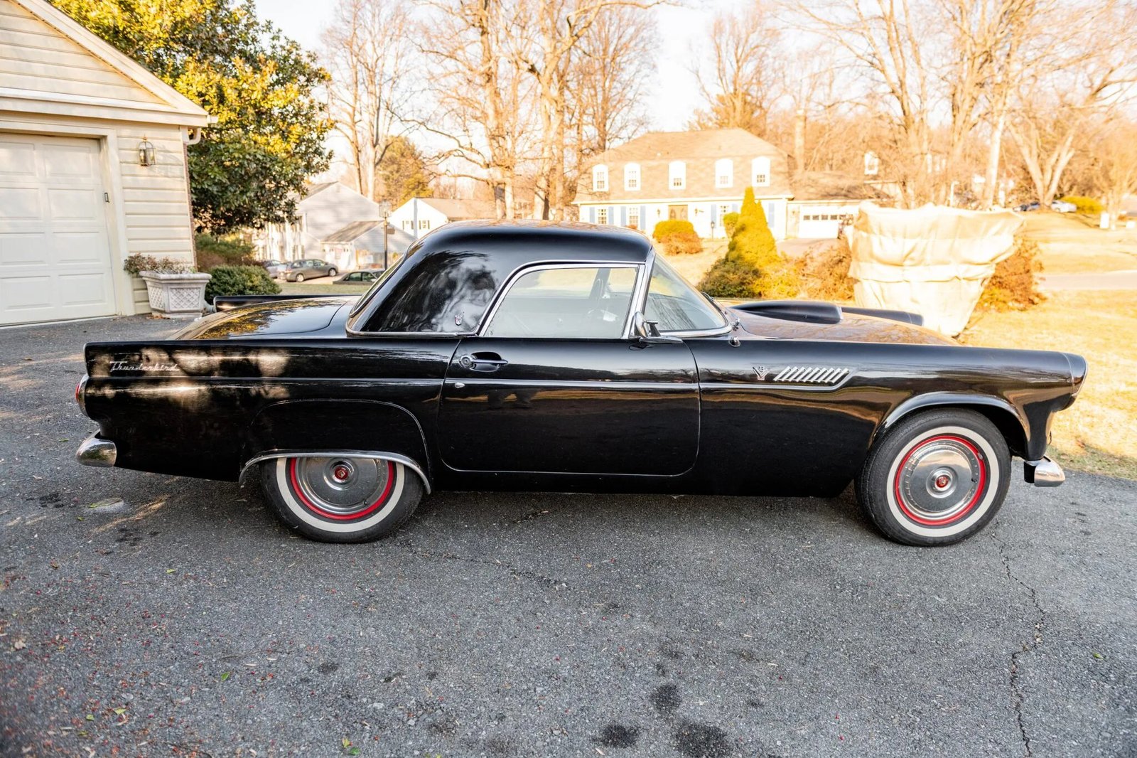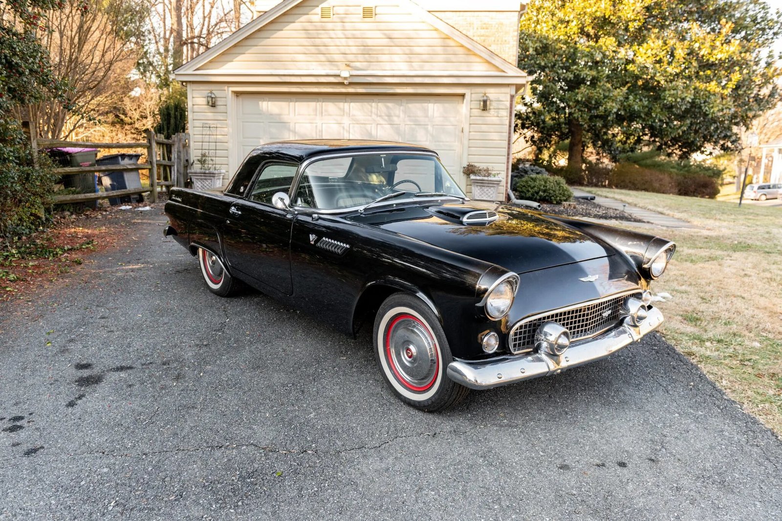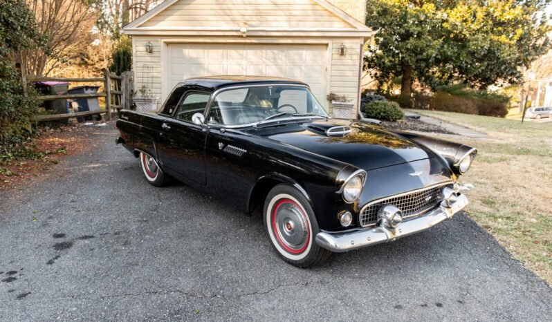 This 1955 Ford Thunderbird is powered by a 292ci V8 paired with a three-speed automatic transmission, and equipment includes a black soft top, a removable black hardtop, 15″ steel wheels, power windows, a Sony CD stereo, and a power-adjustable bench seat with two-tone upholstery.