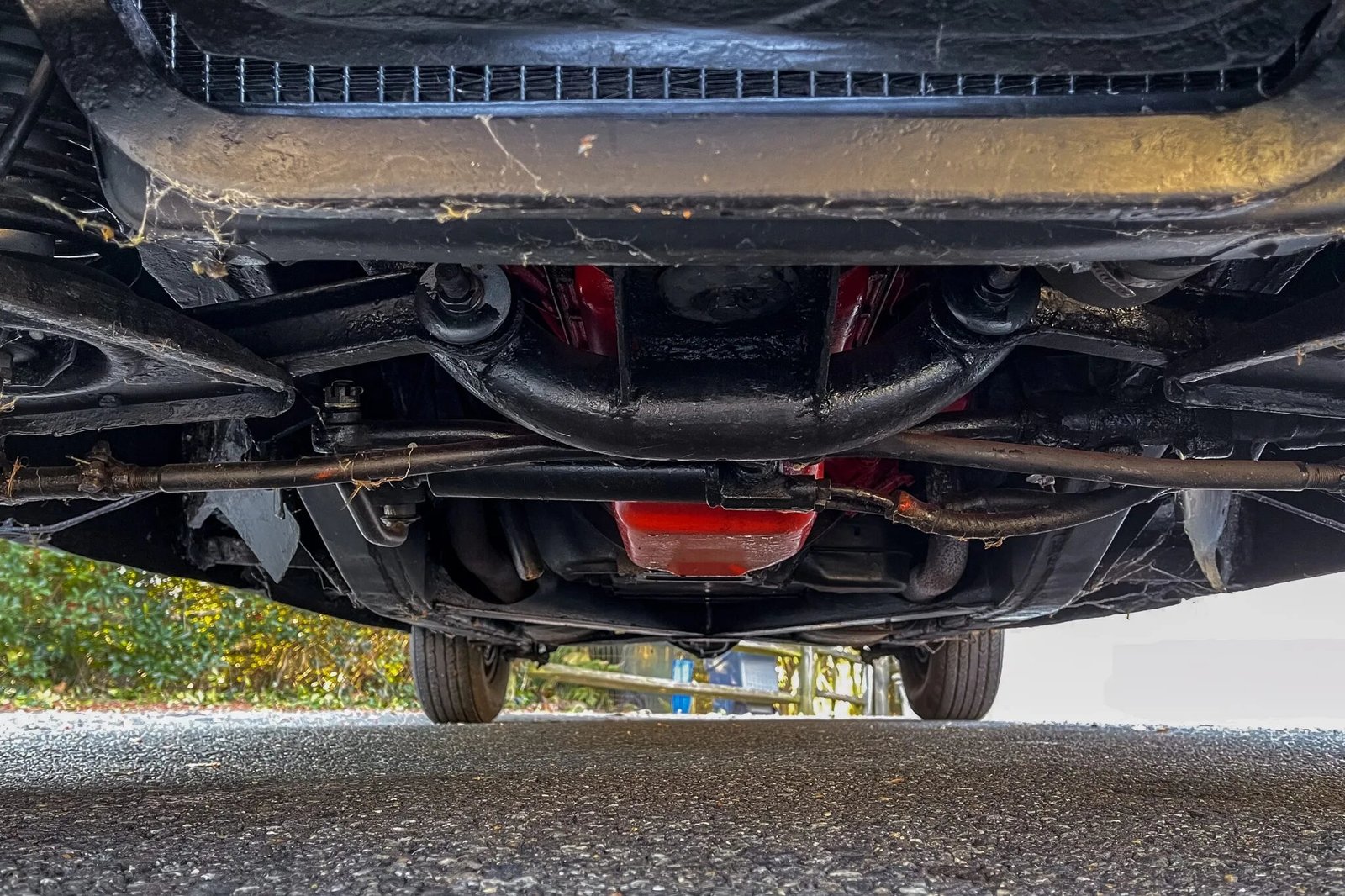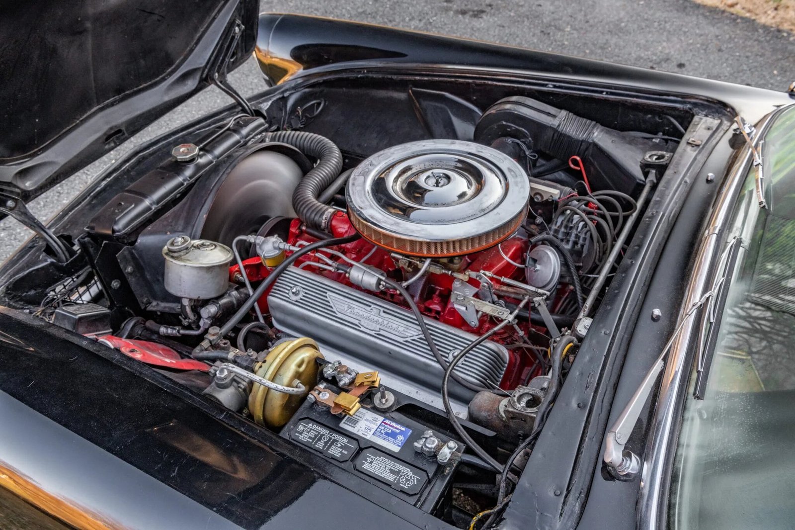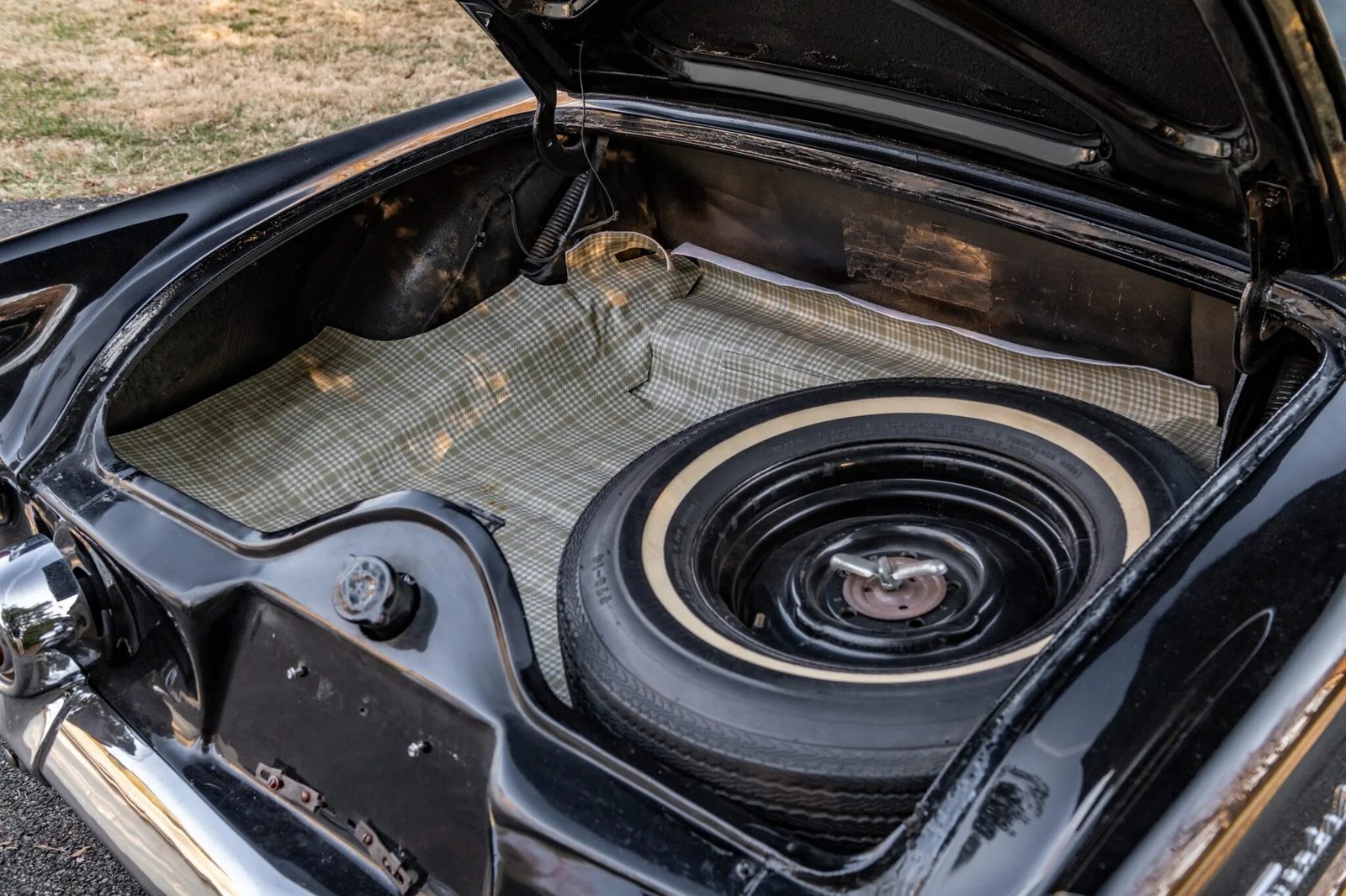 Steel 15″ wheels are finished in red and wear chrome covers and Goodyear 205/75 whitewall tires, and a spare is mounted in the trunk.