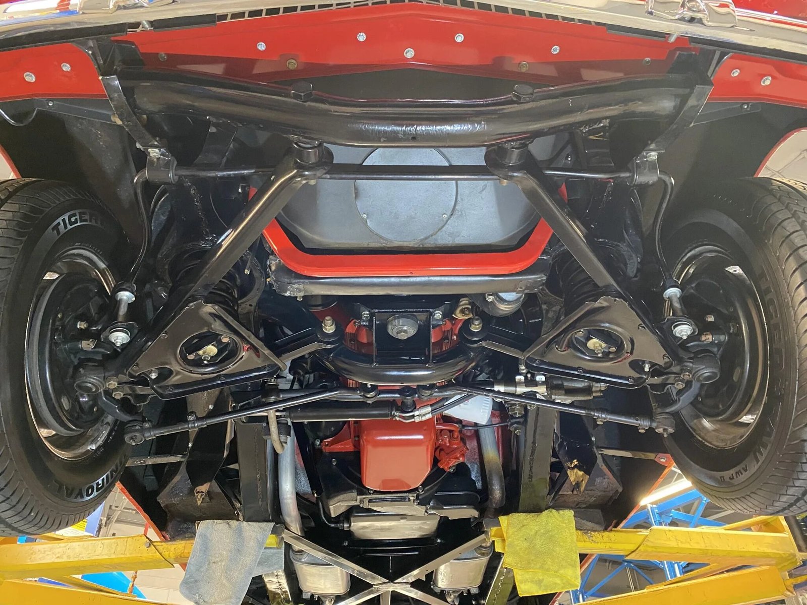 Chrome-finished 15″ wire-spoke wheels wear three-eared spinners and are mounted with 205/75 Uniroyal Tiger Paw AWPII narrow-whitewall tires.