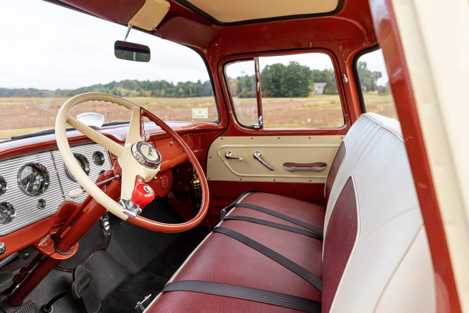 The body-color cab features two-tone white and red upholstery for the bench seat along with white door panel inserts and headliner material.