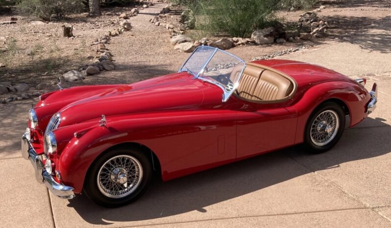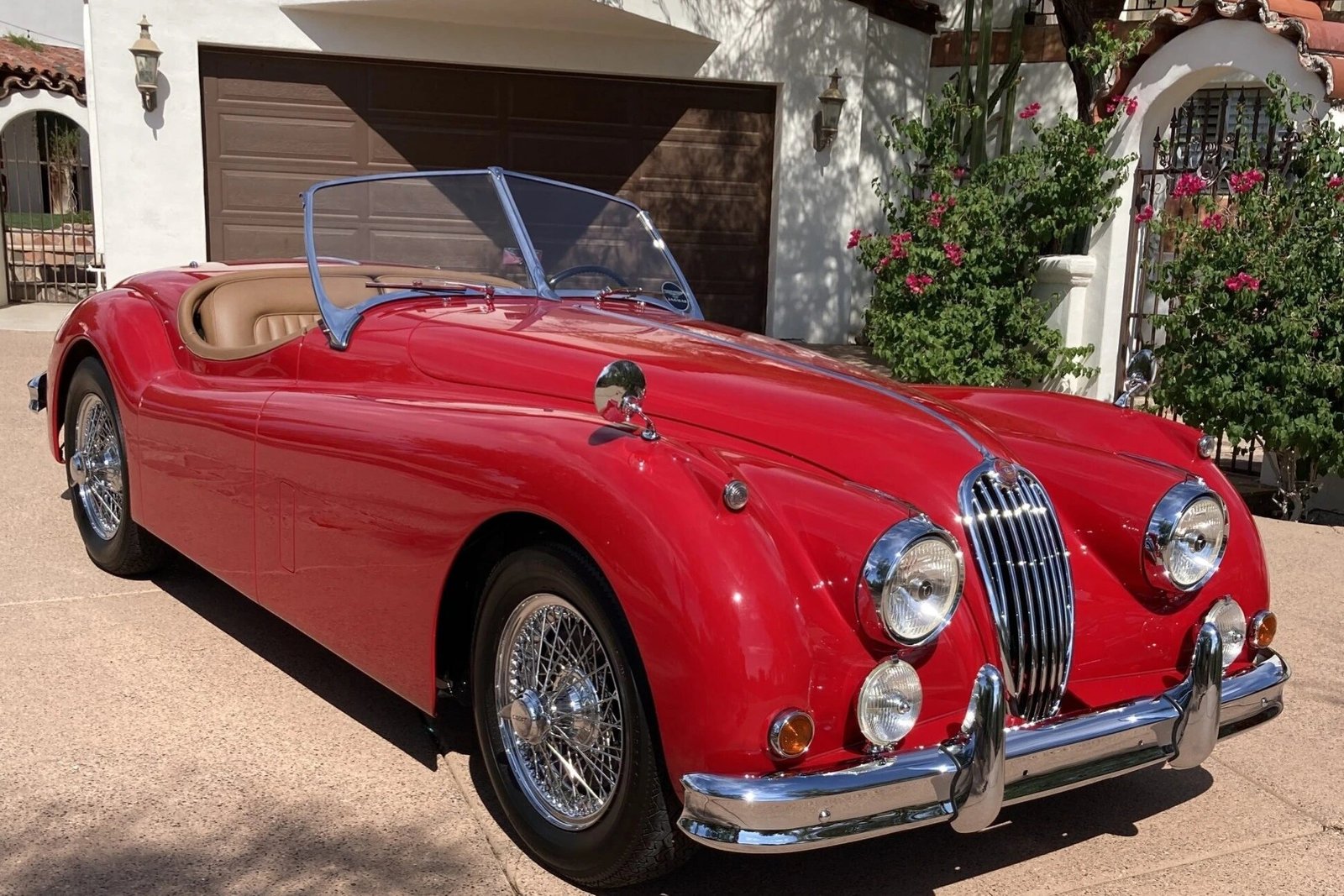 Chrome-finished 16″ wire wheels secured by Jaguar-branded knock-offs are mounted with 185-series Firestone Cavallino Sport 200 tires.