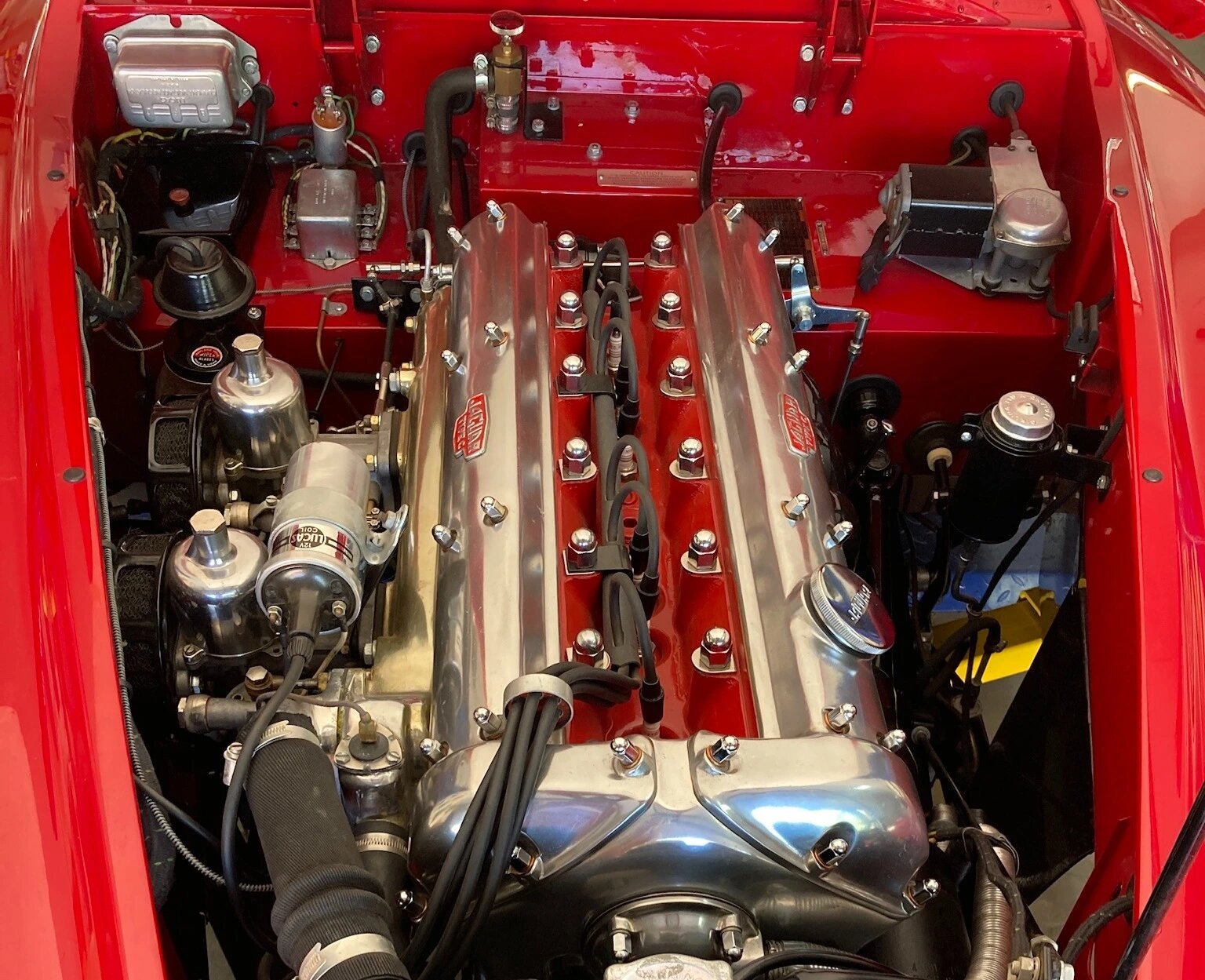 The 3.4-liter inline-six features double overhead camshafts and twin SU carburetors.