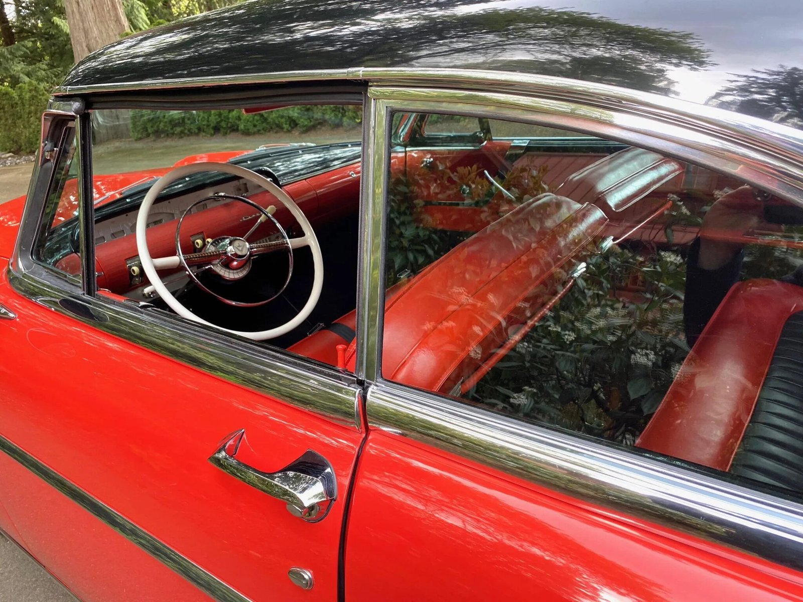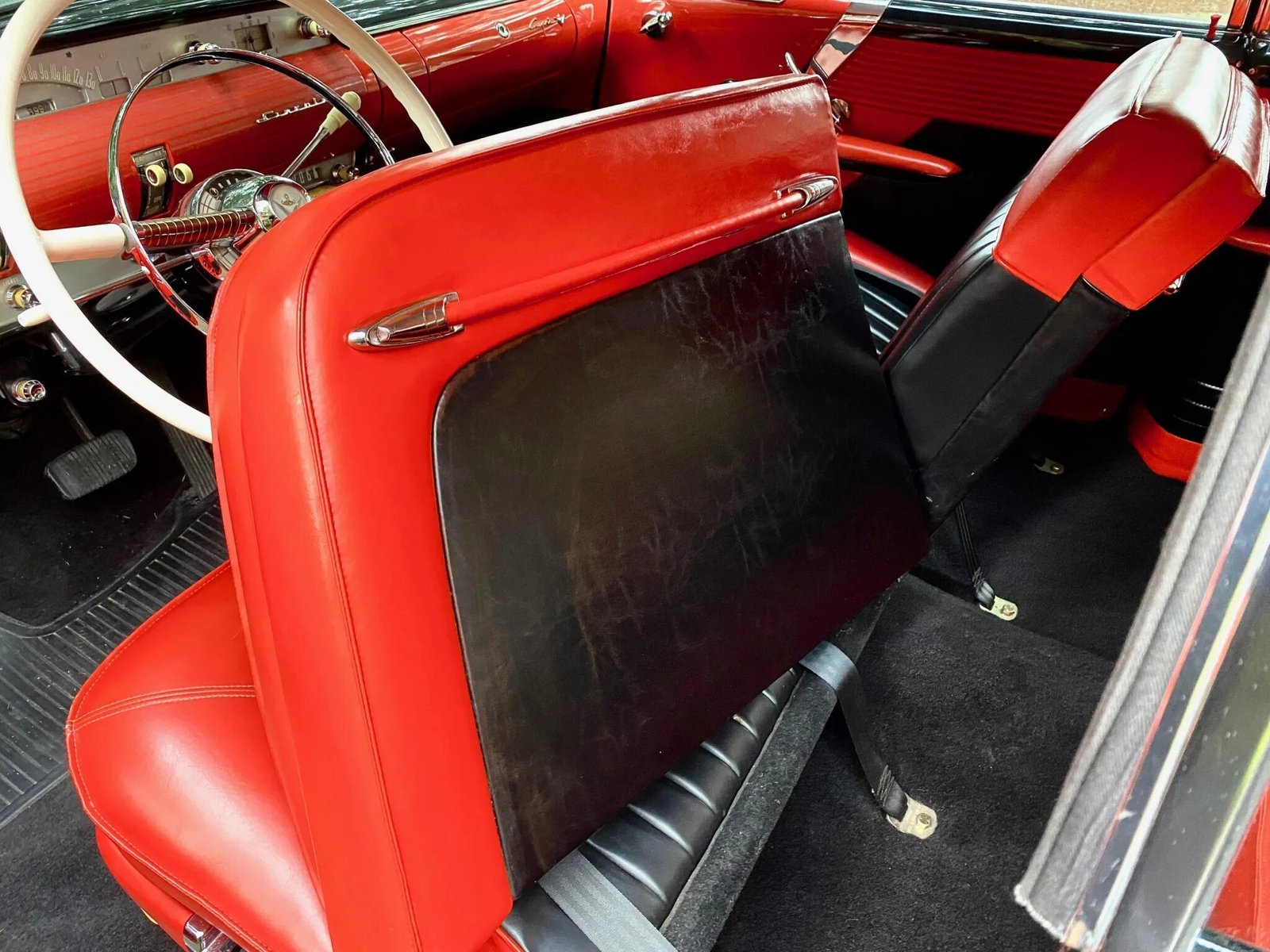 The interior features a two-tone red and black scheme on the front and rear bench seats, door panels, and rear side panels.