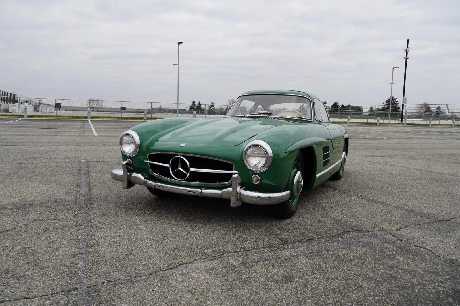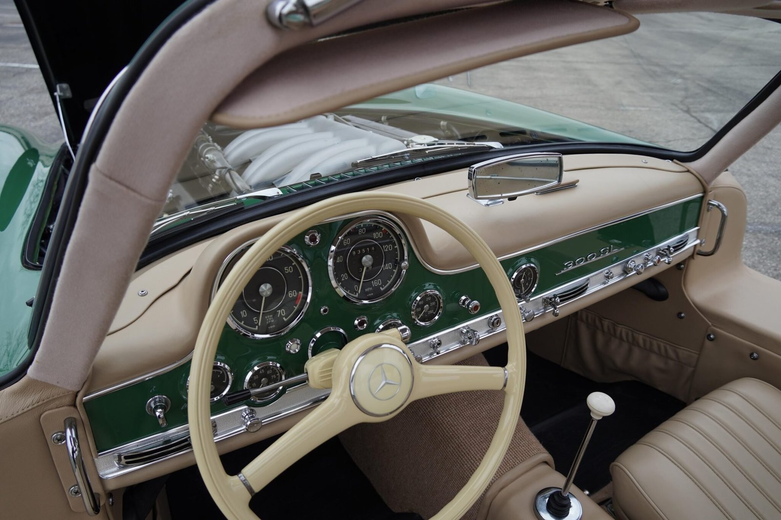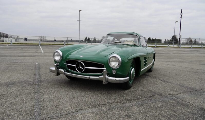 This 1955 Mercedes-Benz 300SL is one of 1,400 Gullwing coupes built between 1954 and 1957 and was shipped from the factory on April 30, 1955. Chassis 040.5500263 is a US-market example. The car is finished in green over beige leather upholstery, and power comes from a numbers-matching, fuel-injected 3.0L inline-six paired with a four-speed manual transmission. Service performed in preparation for sale included the installation of a new battery and hold-down rods, fuel filter housing, rubber floor mats, engine decals, a rebuild of the water pump, the addition of fresh transmission and clutch fluids, and flushes of the brake and fuel systems.