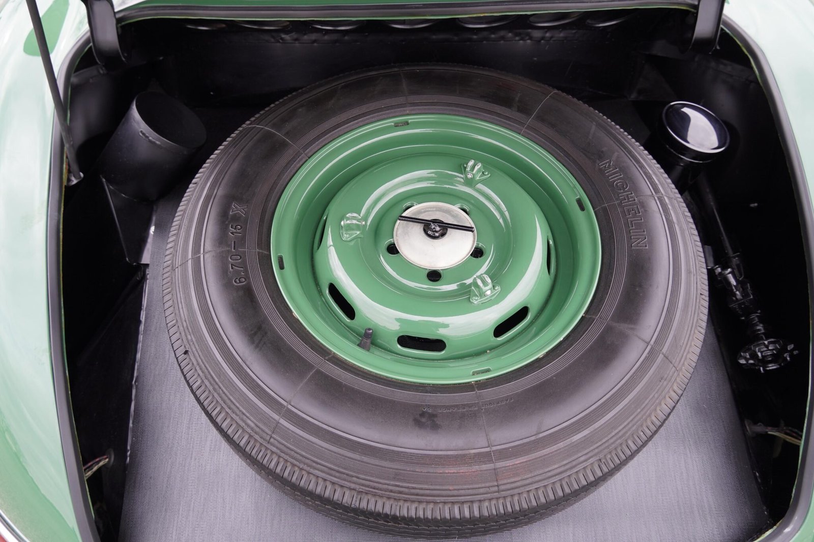 Body-color 15” wheels wear matching covers with polished Mercedes stars. Michelin 180HR15 XAS radial tires are fitted, and a matching spare wheel with a 6.70–15 Michelin X tire is mounted in the trunk.
