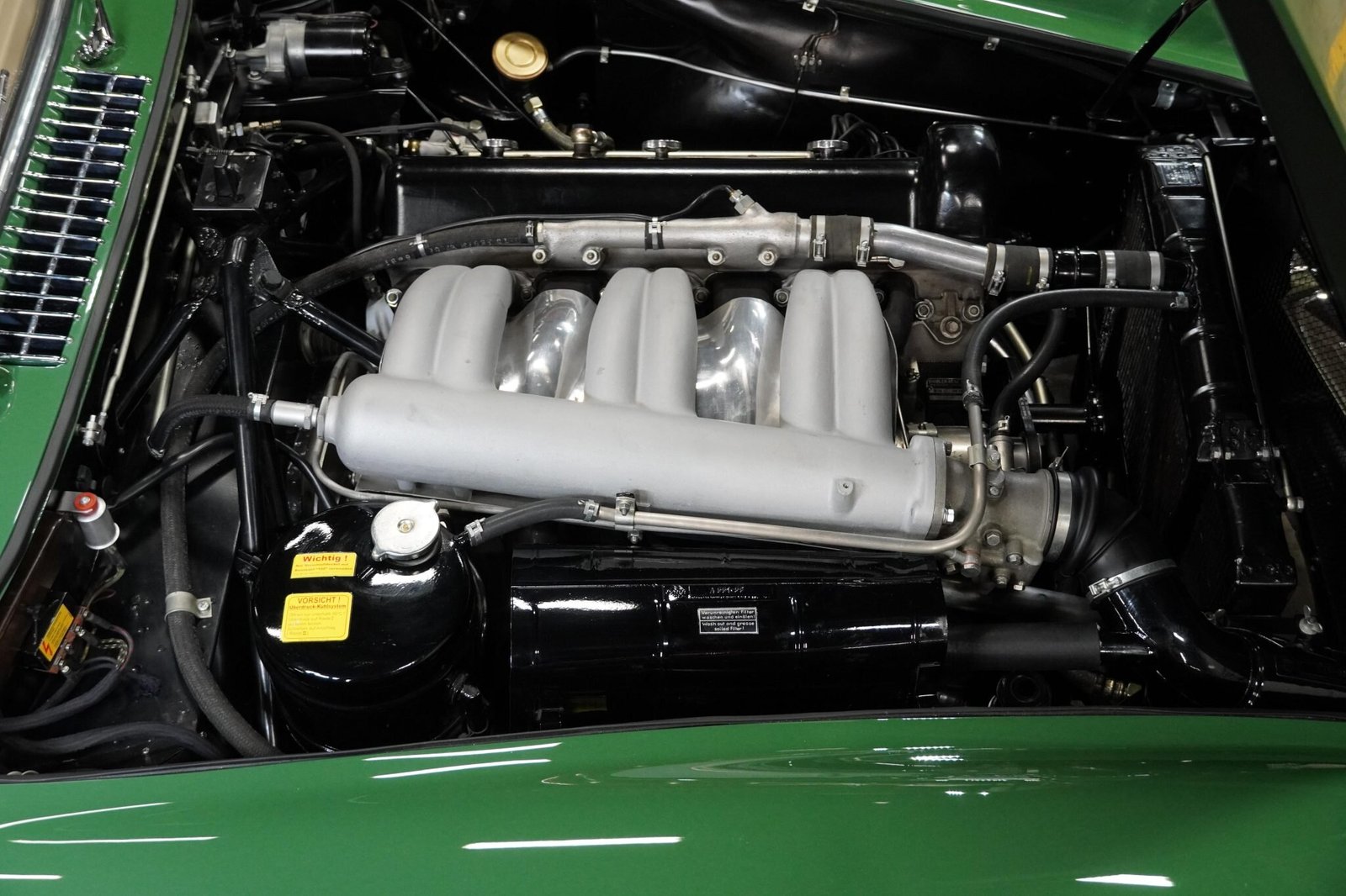 Finished from the factory in Mittelgrün (DB-229G), this example underwent a color change to blue, replacement steel panels sourced from the Mercedes-Benz Classic Center of Fellbach, Germany, were fitted around the front inner and outer fenders, wheel wells, and trunk floor before the car was repainted green during the 2000s refurbishment.
