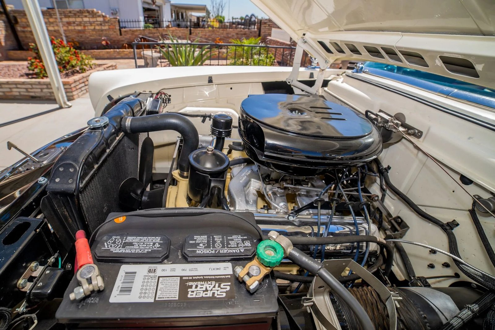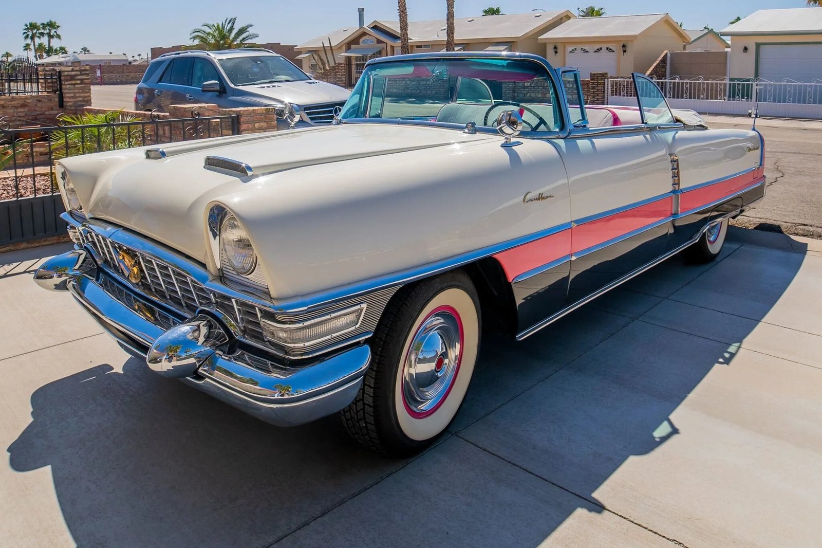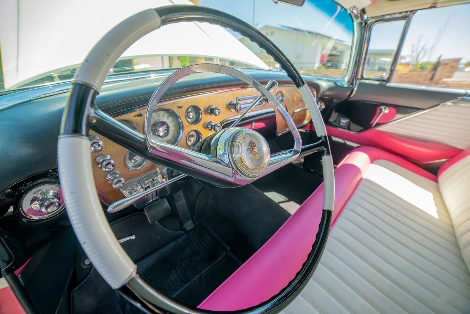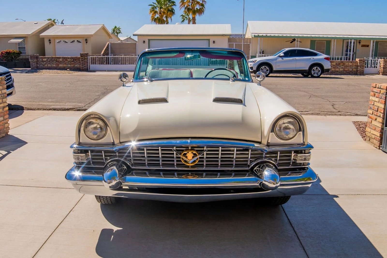 This 1955 Packard Caribbean is one of 500 convertibles built for the model year.The car is finished in white with charcoal and pink accents over matching upholstery, and power comes from a 352ci V8 paired with an Ultramatic two-speed automatic transmission. Features include a white soft top, power windows, and an AM radio, while modifications consist of front disc brakes and an alternator.