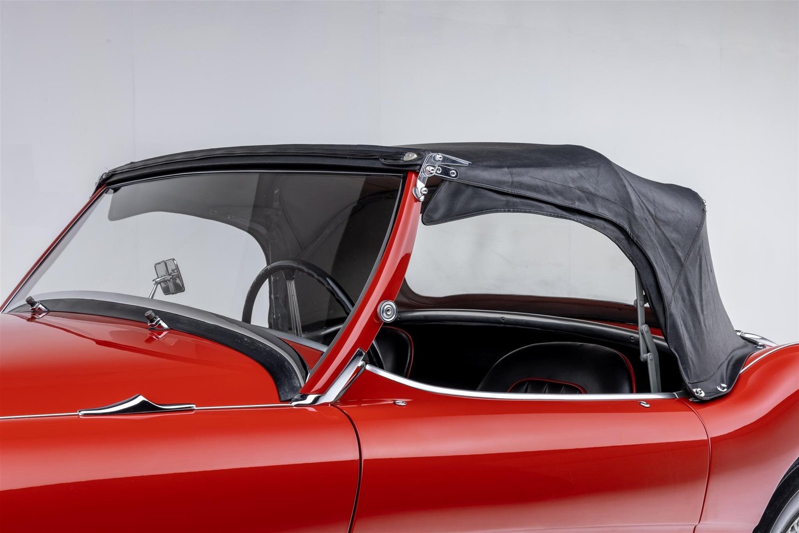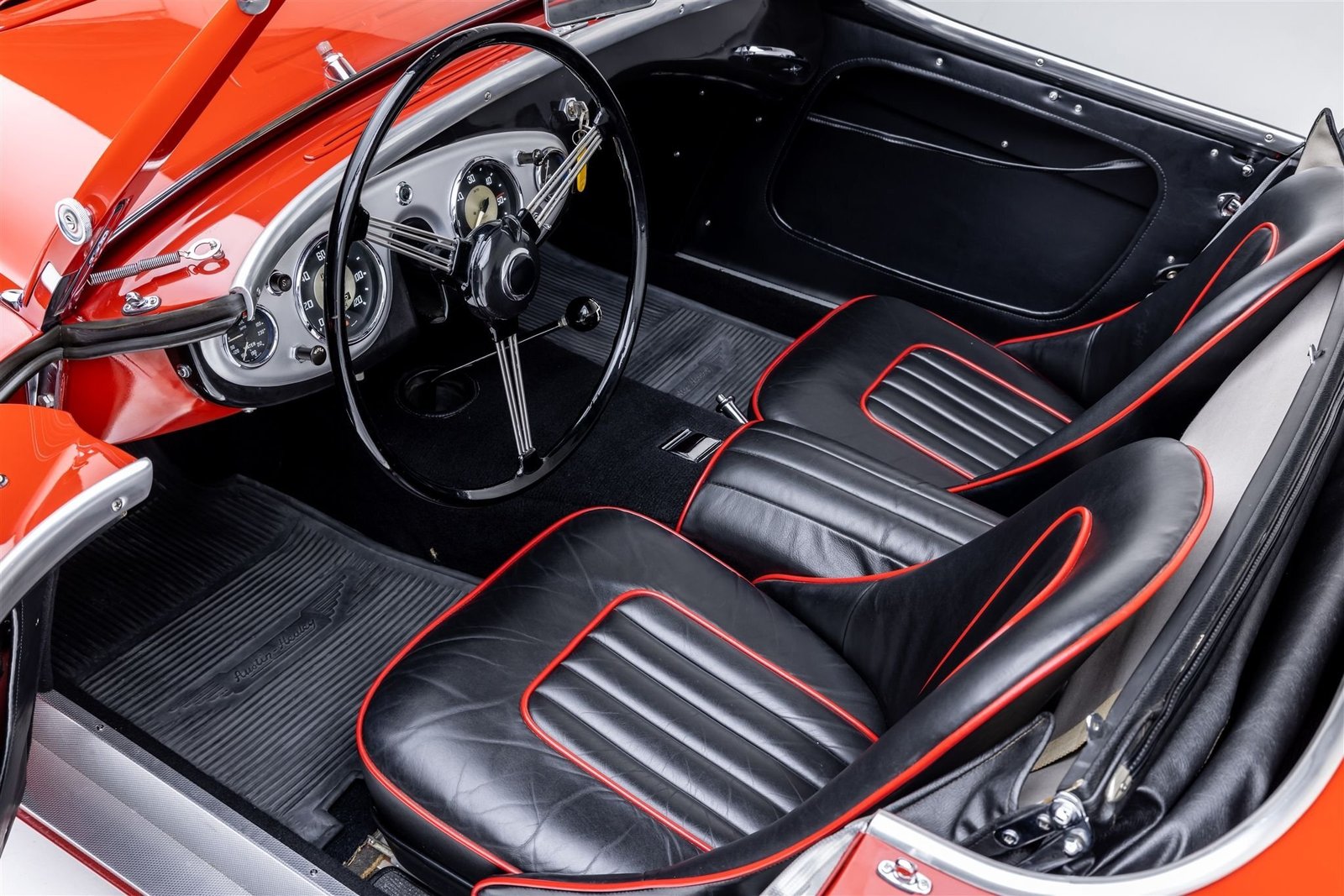 The cabin is upholstered in black and the seats and transmission tunnel pad have been retrimmed in black leather with red piping.