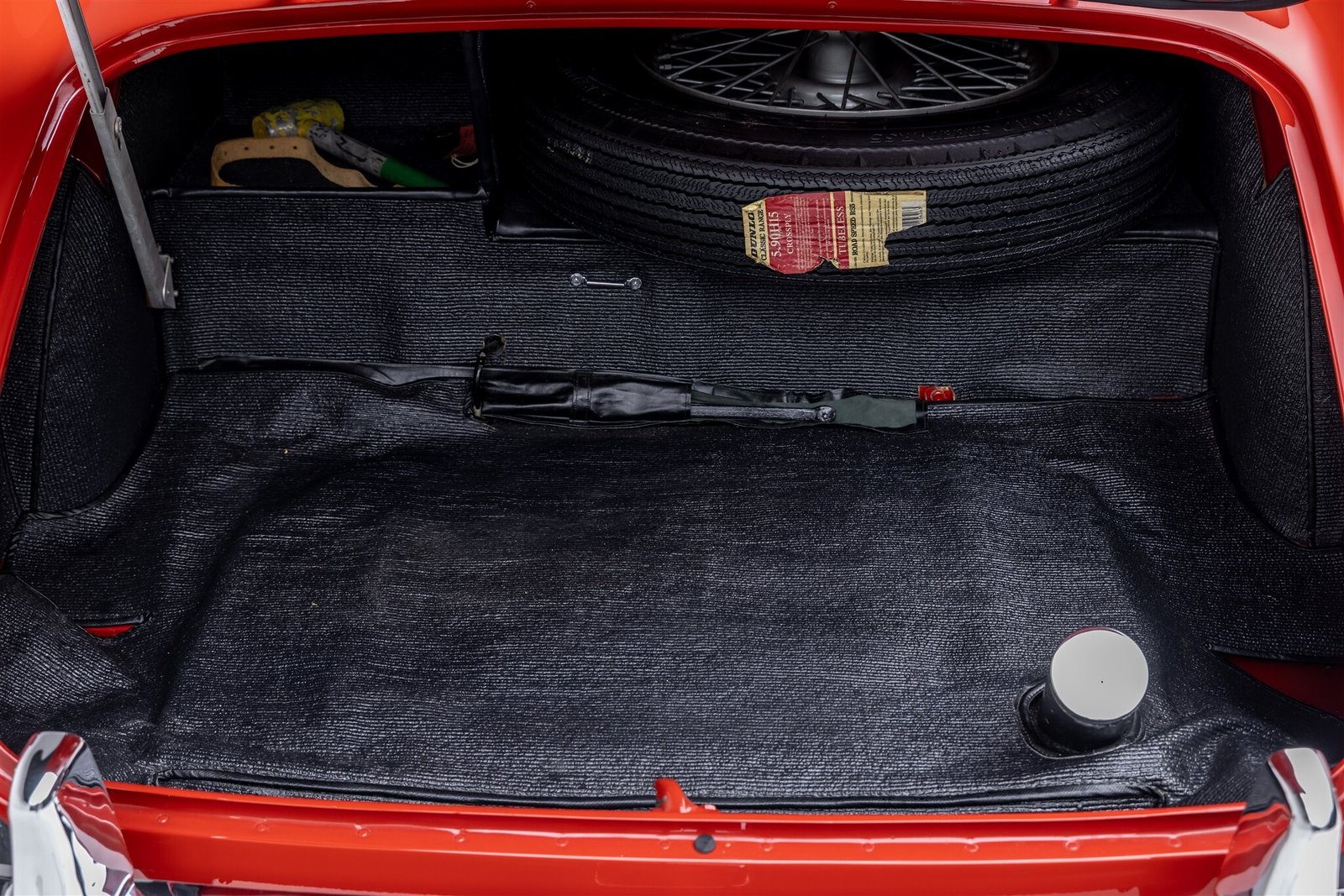 Painted 15″ wire wheels with two-eared knockoffs are mounted with period-style Dunlap Classic Range Nylon tires.
