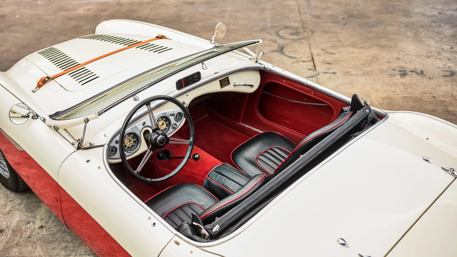 Additional details include a factory banjo-spoked steering wheel, a dash-mounted rearview mirror, and a 100M Registry badge affixed to the body-colored dash.