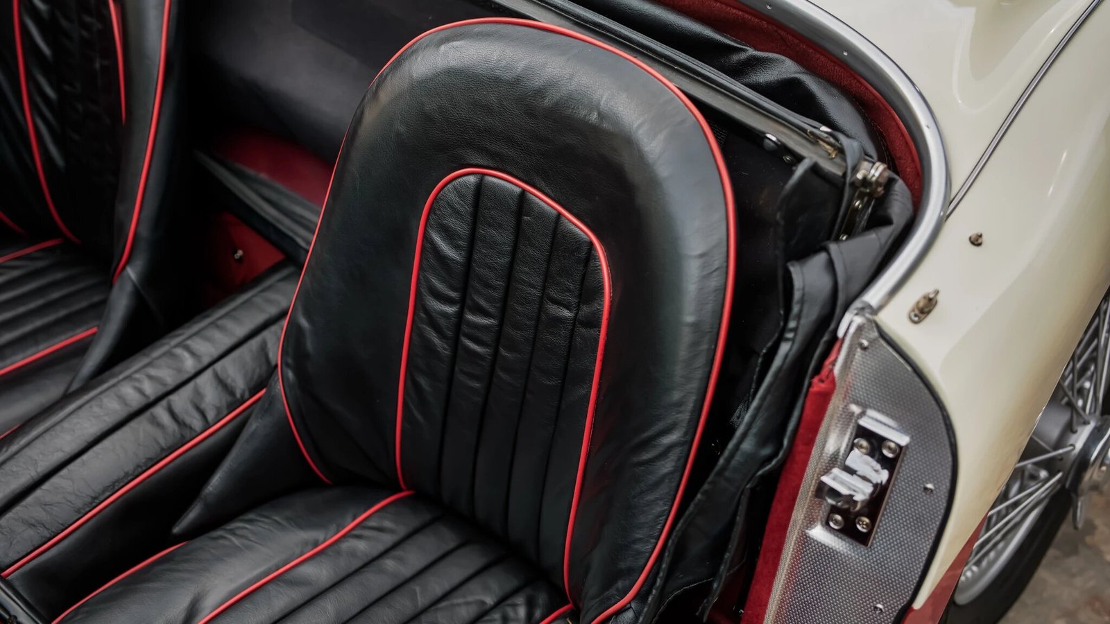 The interior features black leather with red piping over the seats and driveshaft tunnel, along with red carpeting, door panels, and trunk lining.