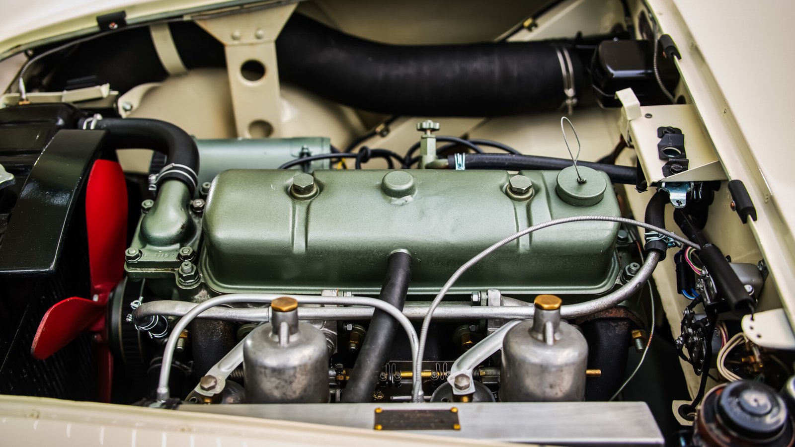The louvred bonnet is secured by a leather strap and is noted on the BMIHT Certificate as factory equipment, distinguishing the car as a factory-built 100M.