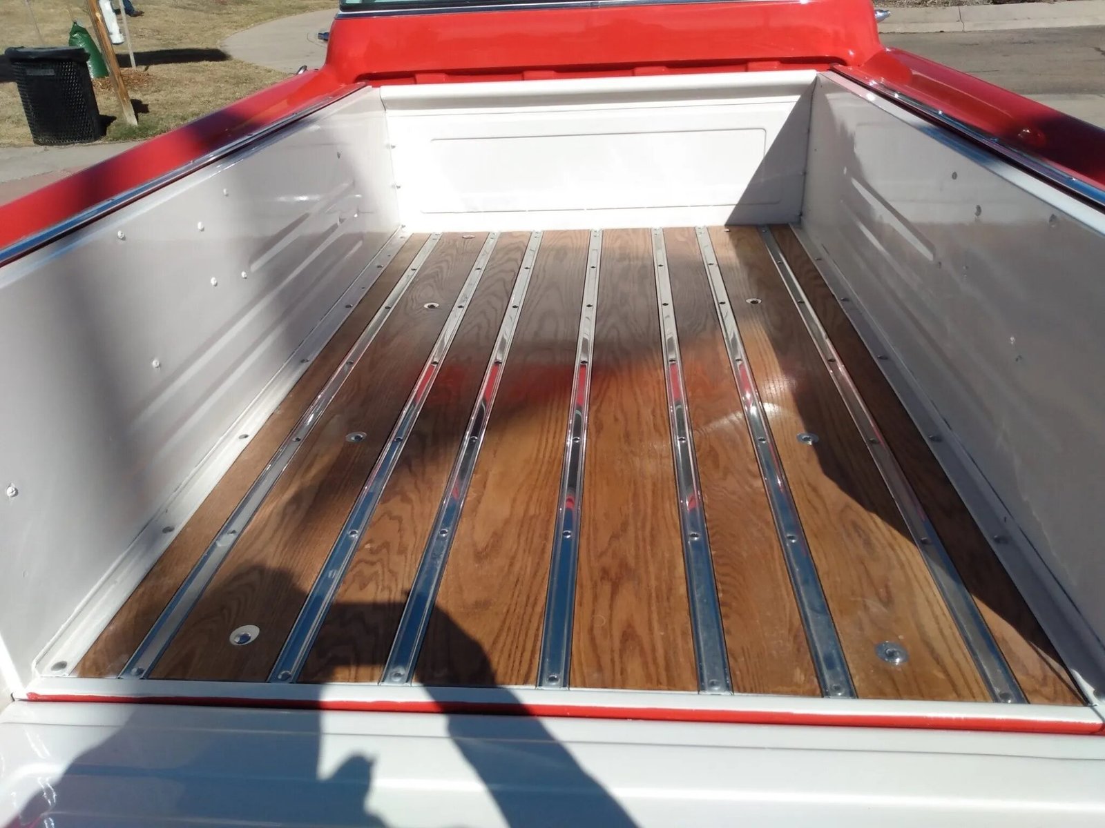 Cameo pickups were equipped with molded fiberglass outer bedsides and outer tailgate skins. This example was repainted in red and white during the refurbishment, and additional exterior details include an oak bed floor, a roof-mounted sun visor, chrome trim and taillamp surrounds, a fiberglass concealed spare tire carrier behind the bumper, a wraparound windshield and big rear window, and dual exhaust outlets. The body was stripped and rust repairs were performed prior to the body being painted. Work consist of replacing the chrome grille, glass, vent windows, door glass, seals, polished and chrome trim, mirrors, front and rear bumpers, bed bolts, tailgate cables, fender spools, door handles, and exterior lights.