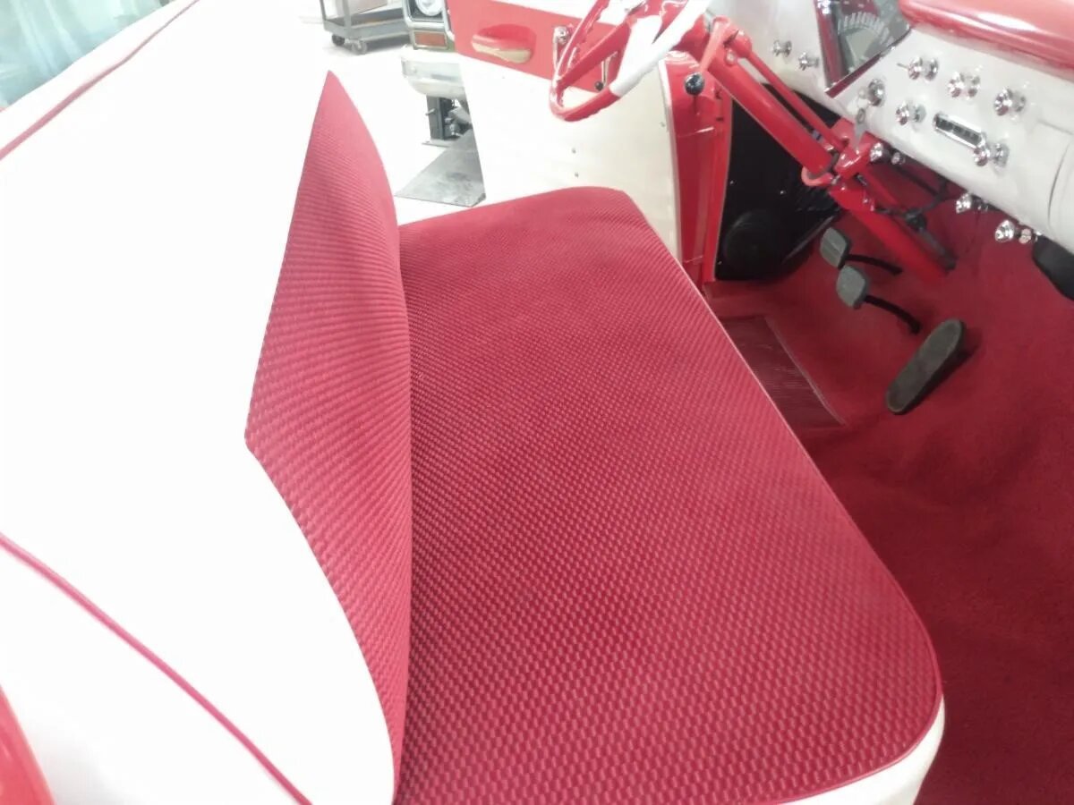 The bench seat and door panels are trimmed in white vinyl with red patterned cloth inserts. The sheet metal surfaces are finished to match the exterior, and equipment includes a heater and defroster, chrome hardware and knobs, aftermarket kick panel speakers, and a retro-style digital stereo. The seats were reupholstered and the interior door and dashboard hardware, headliner, wiring harness, carpeting, and door seals have been replaced.