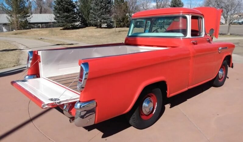 This 1956 Chevrolet 3100 Cameo pickup is one of 1,452 examples produced for the model year and is finished in red and white over matching upholstery and powered by a 265ci V8 linked to a three-speed manual transmission. Equipment includes 15″ steel wheels with center caps, a wood bed floor, a wraparound windshield and rear window, chrome trim, fiberglass bedsides, dual exhaust outlets, a retro-style digital stereo, and a Power Pack four-barrel carburetor, intake manifold, camshaft, and cylinder heads. Subsequently underwent a three-year refurbishment. Work consisted of rust repairs, stripping and repainting the body and chassis, rebuilding the engine and transmission, overhauling the brakes, reupholstering the interior, and replacing suspension, interior, and exterior components.