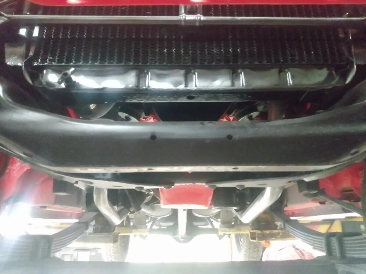 Power is sent to the rear wheels through a three-speed manual transmission. Service during the refurbishment included rebuilding the transmission and replacing the clutch and throwout bearing. An aftermarket dual exhaust system has been installed.