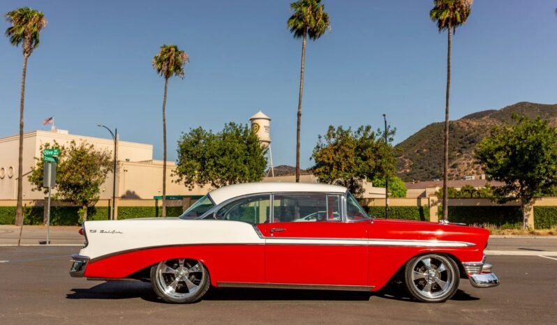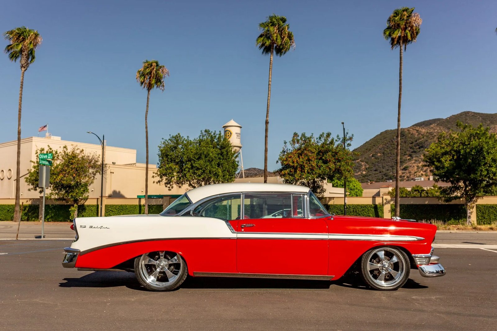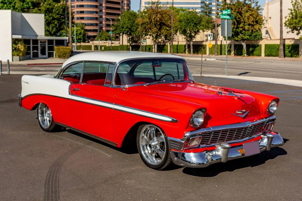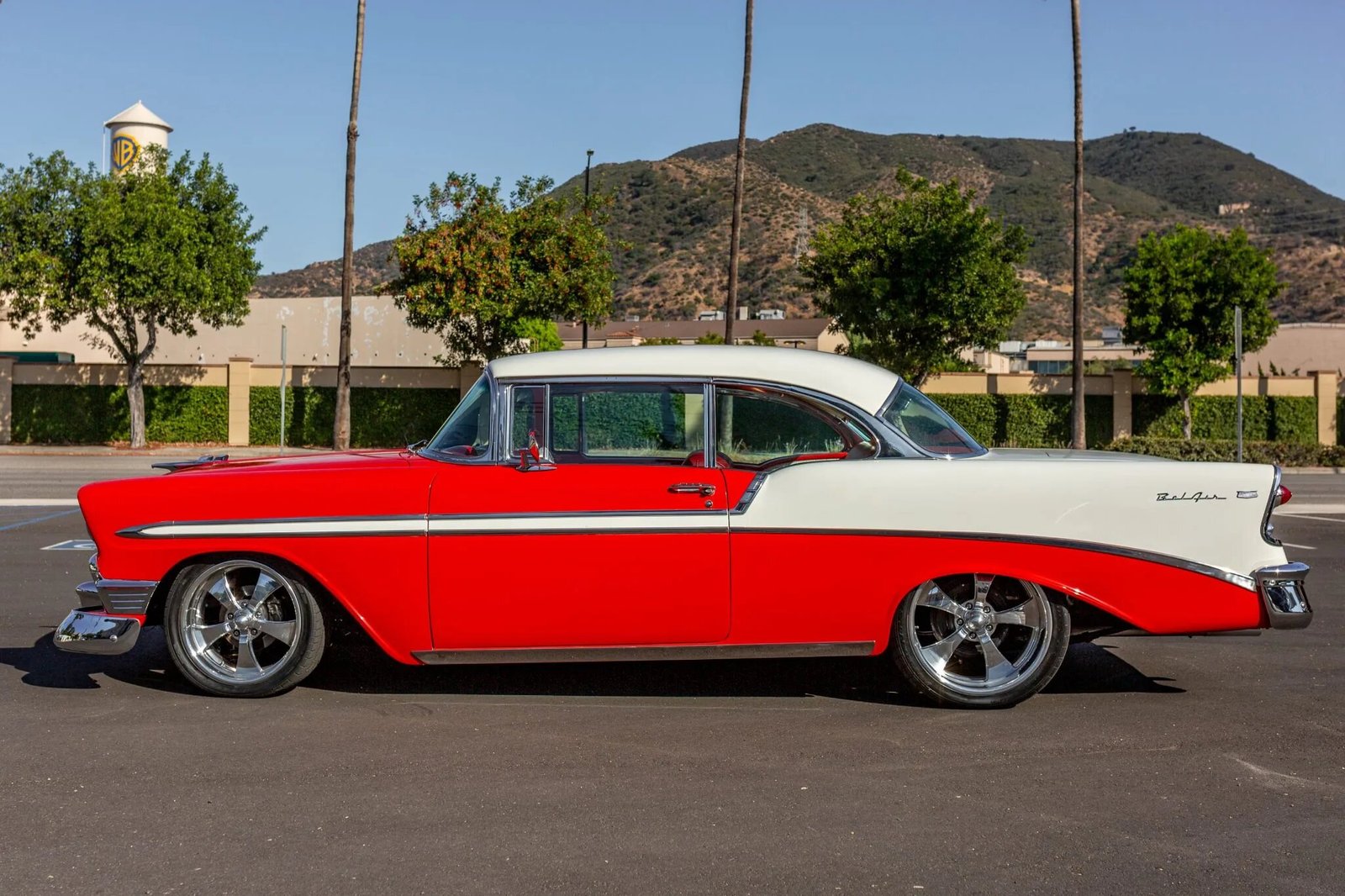 This 1956 Chevrolet Bel Air is a two-door hardtop finished in red and white over matching two-tone vinyl upholstery and is powered by a replacement 350ci ZZ4 V8 mated to a four-speed automatic transmission.