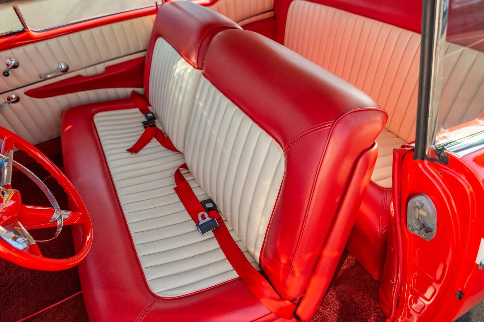 The cabin features a front split bench and a rear bench that were reupholstered in red and white vinyl.