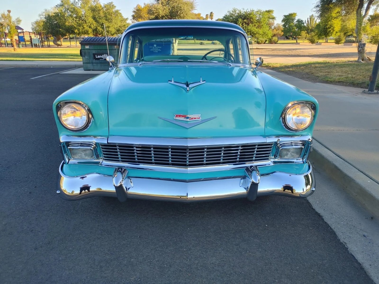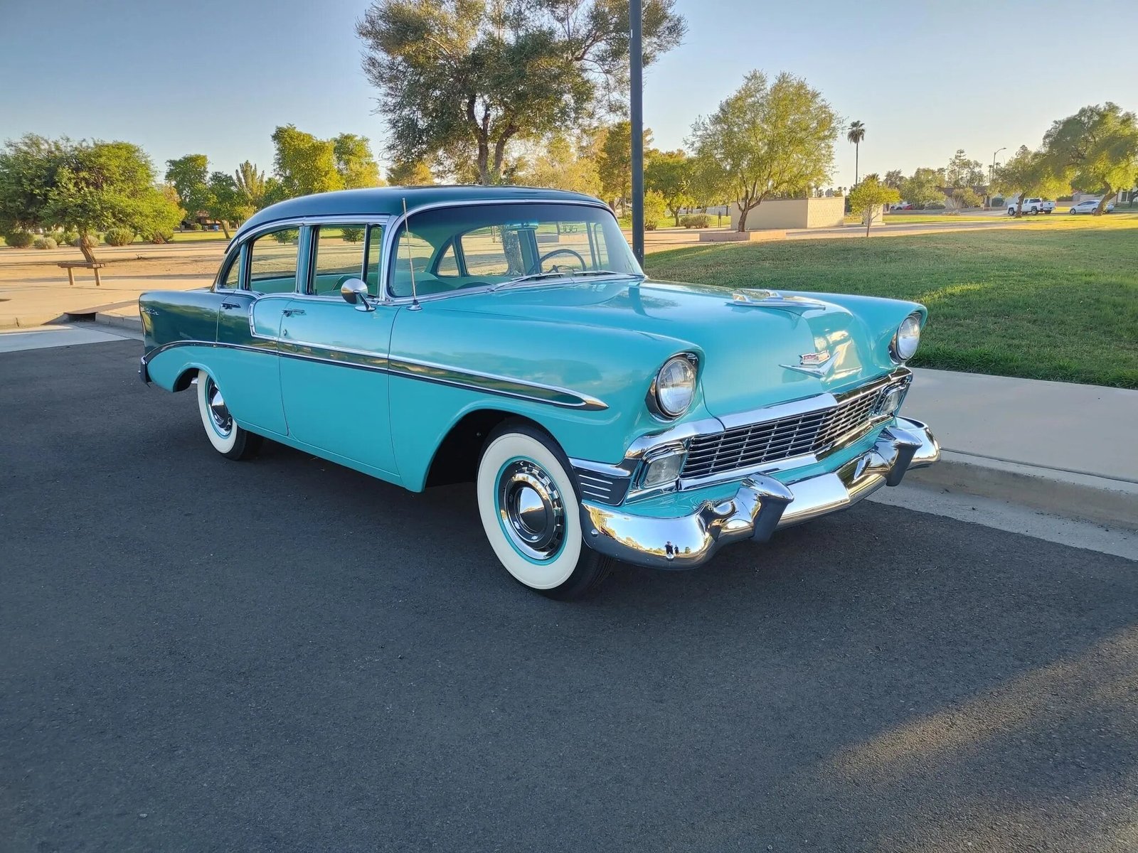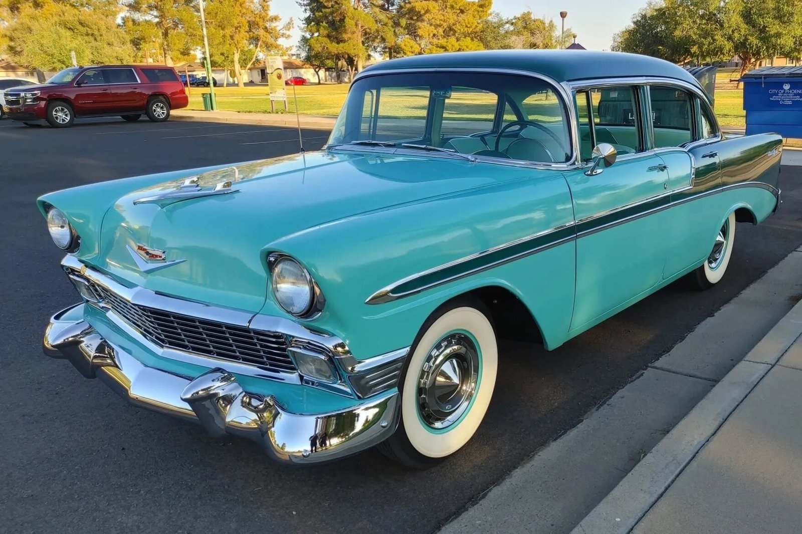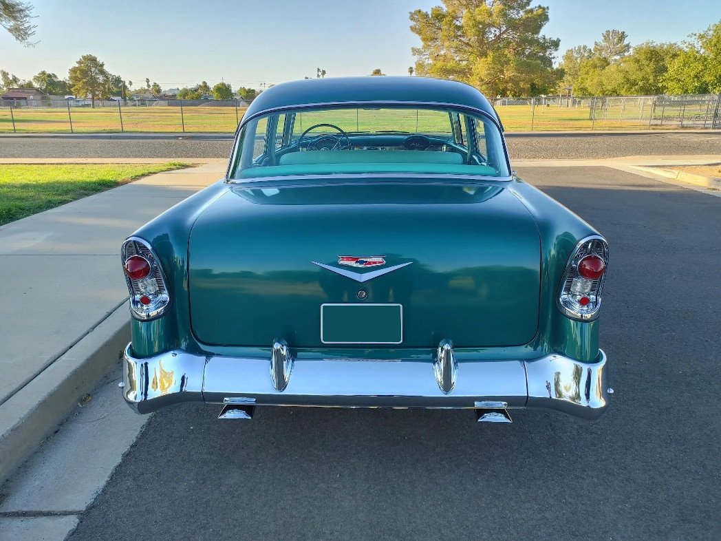 This 1956 Chevrolet Bel Air four-door sedan has been restored and painted two-tone green, the 265ci V8 and Powerglide two-speed automatic transmission have been rebuilt. The interior has been re-trimmed in turquoise vinyl and fabric upholstery and fitted with a RetroSound digital stereo with Bluetooth capability. Additional work is said to have included of overhauling the brakes and suspension, replacing the wiring harness, and installing a dual exhaust system.