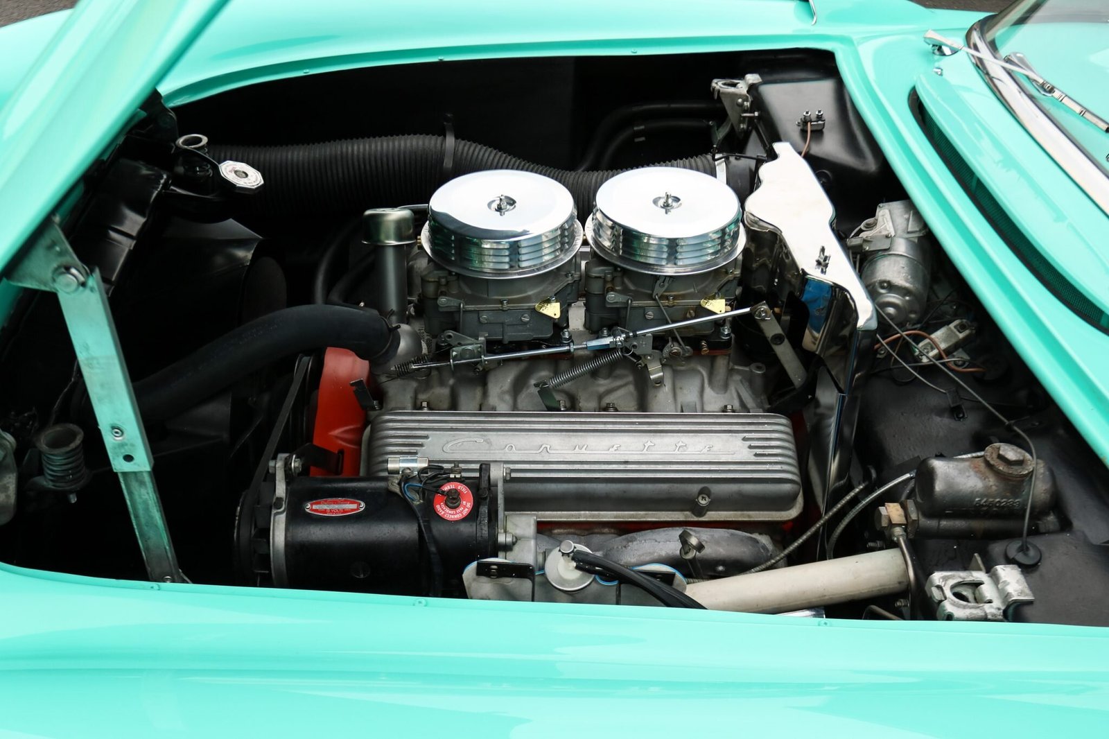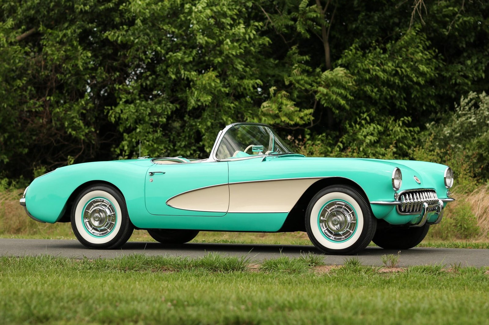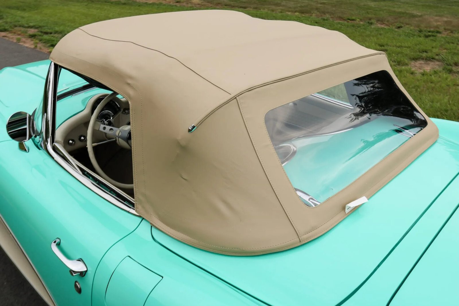 This 1956 Chevrolet Corvette is finished in green and beige over tan vinyl and powered by a 265ci V8 paired with a three-speed manual transmission. Features include dual four-barrel carburetors, a Positraction rear end, a tan soft top, body-color 15″ steel wheels, windshield washers, seat belts, an AM radio, bucket seats, and a twin-cowl dash with a dash-mounted rearview mirror.