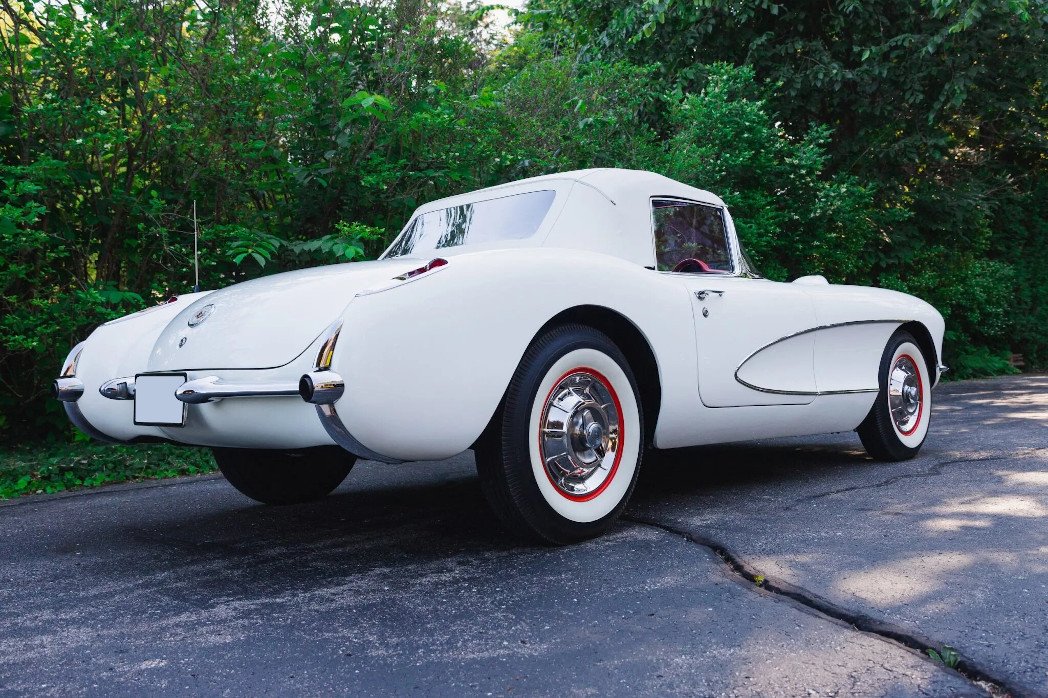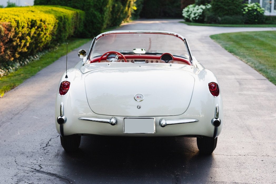This 1956 Chevrolet Corvette is finished in white over red upholstery and is powered by a 265ci V8 paired with a two-speed automatic transmission.