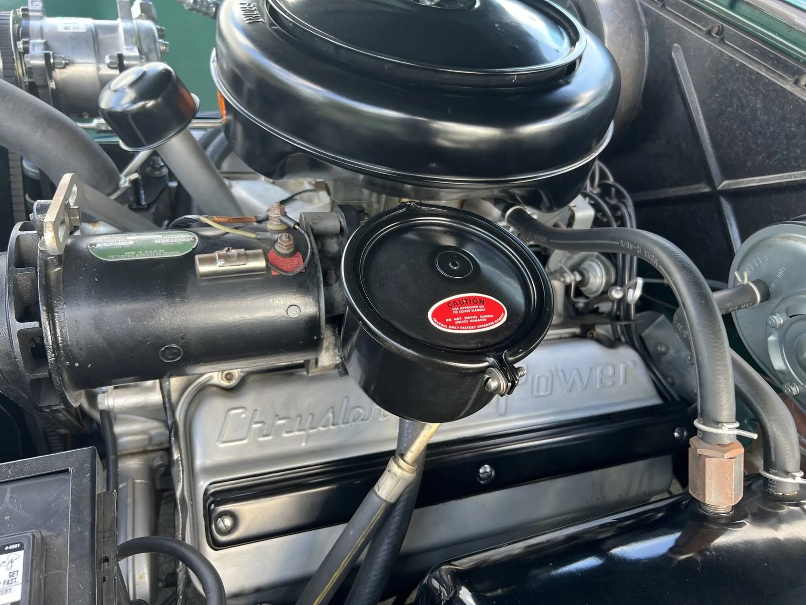 The 354ci V8 is equipped with Chrysler FirePower–branded valve covers, a single carburetor, and a black air-cleaner housing.
