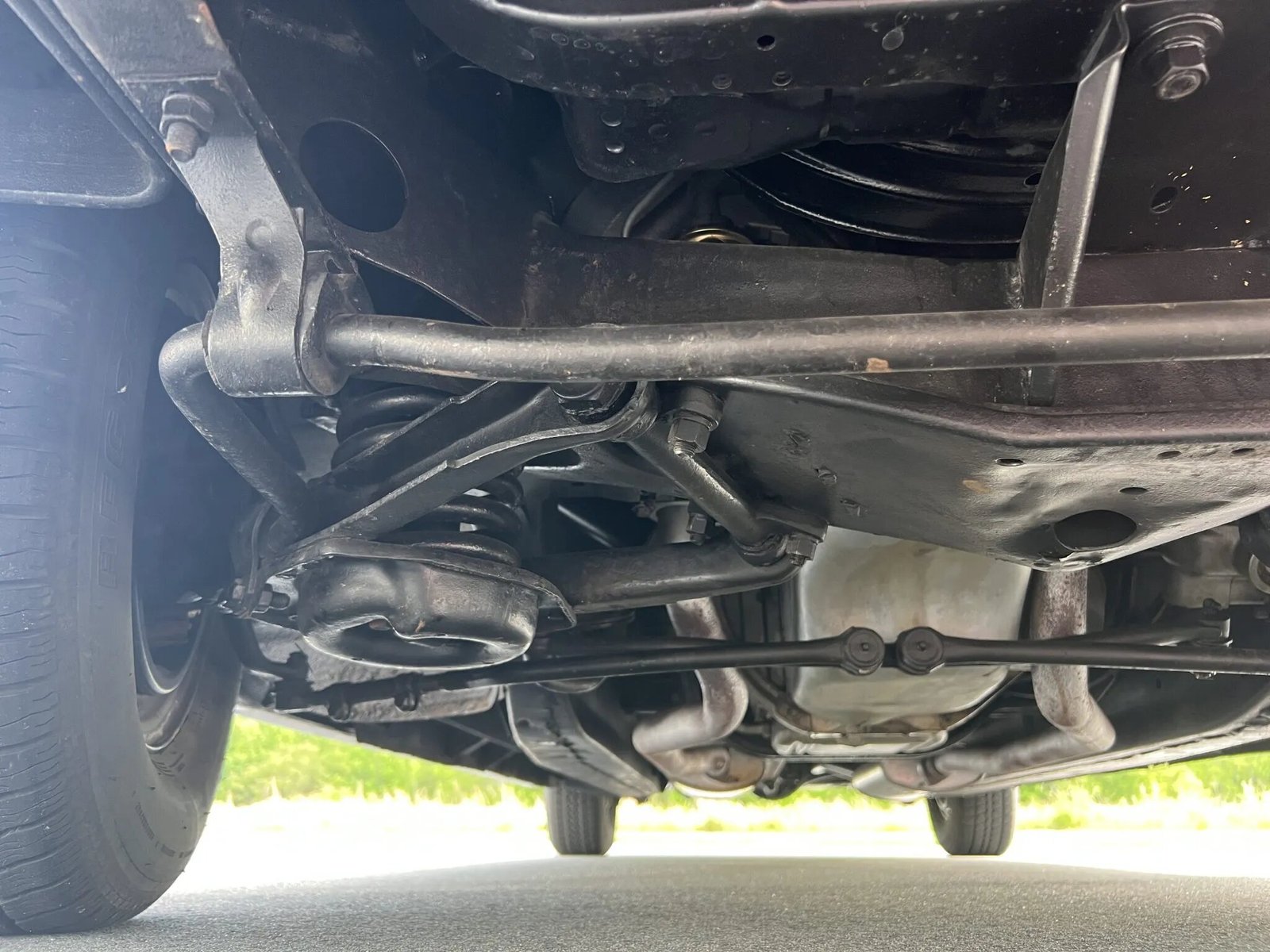 Chrome-finished 15″ wire wheels with knock-off-style hubcaps are mounted with 235/75 BFGoodrich Silvertown Radial whitewall tires.