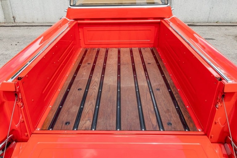 Exterior details include a wood bed floor with painted runners along with a dual exhaust system, chrome bumpers and trim, and wrap-around front and rear windshields.