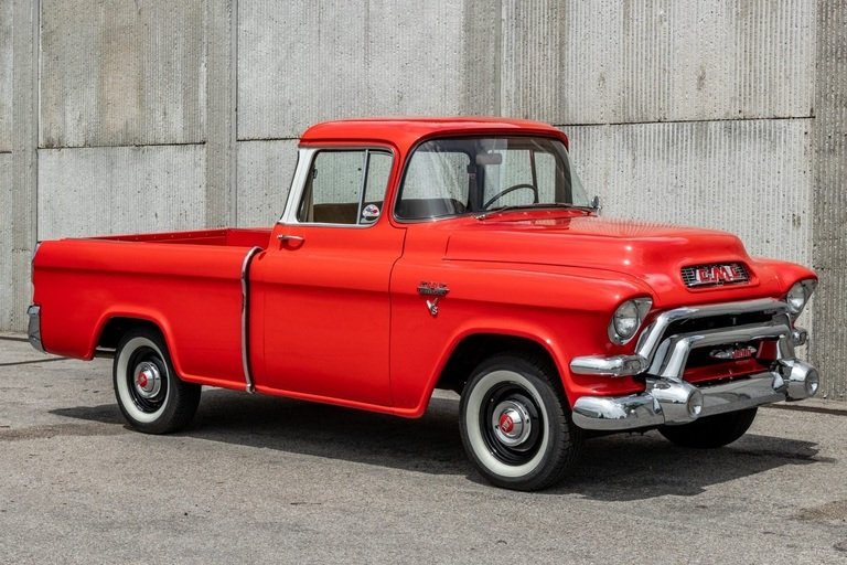 This 1956 GMC Suburban Carrier pickup is finished in red over beige fabric and vinyl upholstery and is powered by a 316ci V8 paired with a Hydra-Matic four-speed automatic transmission.Appointments include a GMC-branded AM radio, a wood bed floor, a dual exhaust system, and steel wheels with chrome hubcaps.