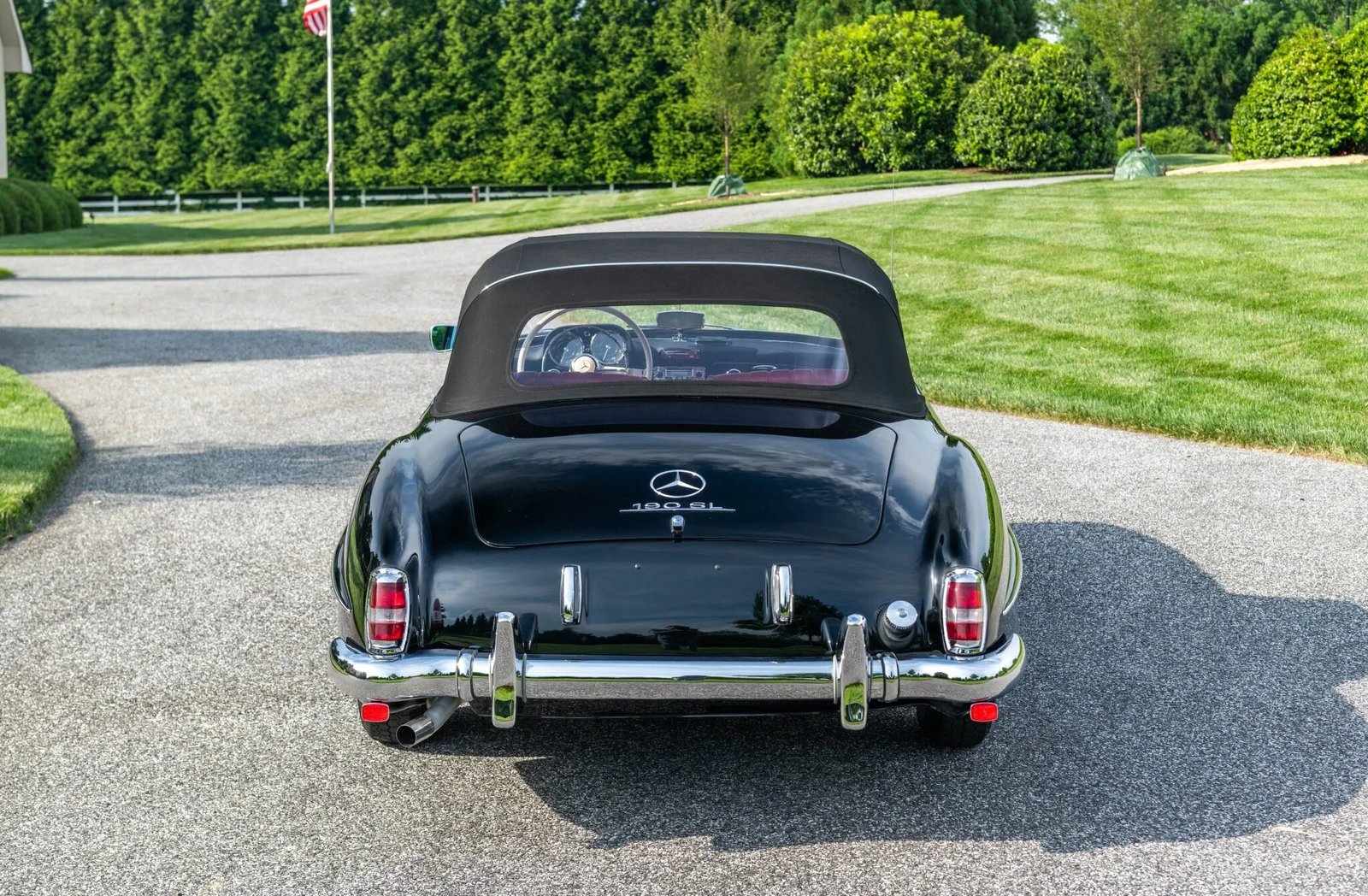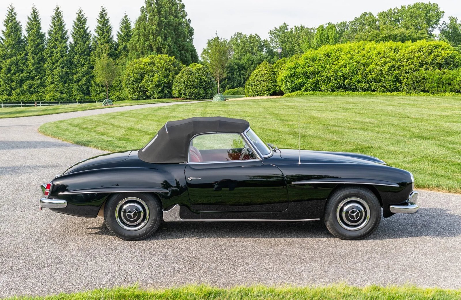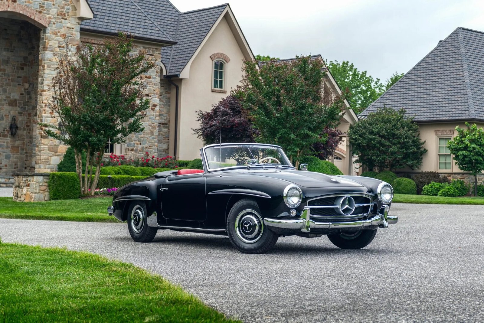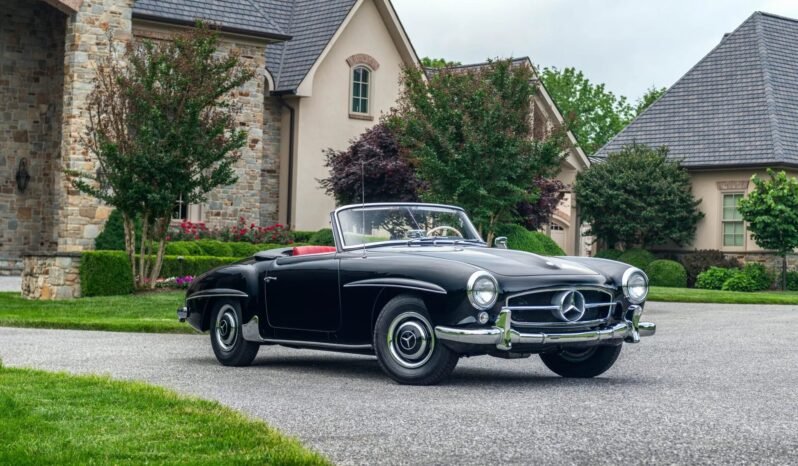 This 1956 Mercedes-Benz 190SL was restored by East Coast Restorations. The car is finished in black over red leather and powered by a 1.9-liter inline-four paired with a four-speed manual transmission. Equipment includes a black convertible top, 13″ steel wheels with body-color hubcaps, chrome bumpers with overriders, a Becker Europa radio, a dashboard-mounted rearview mirror, and bucket seats.