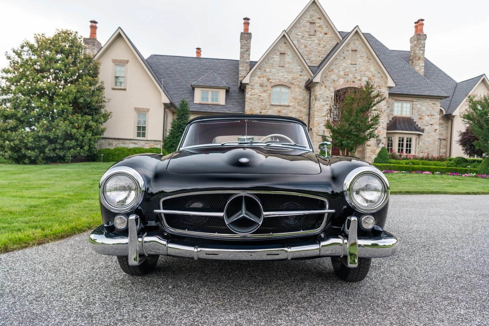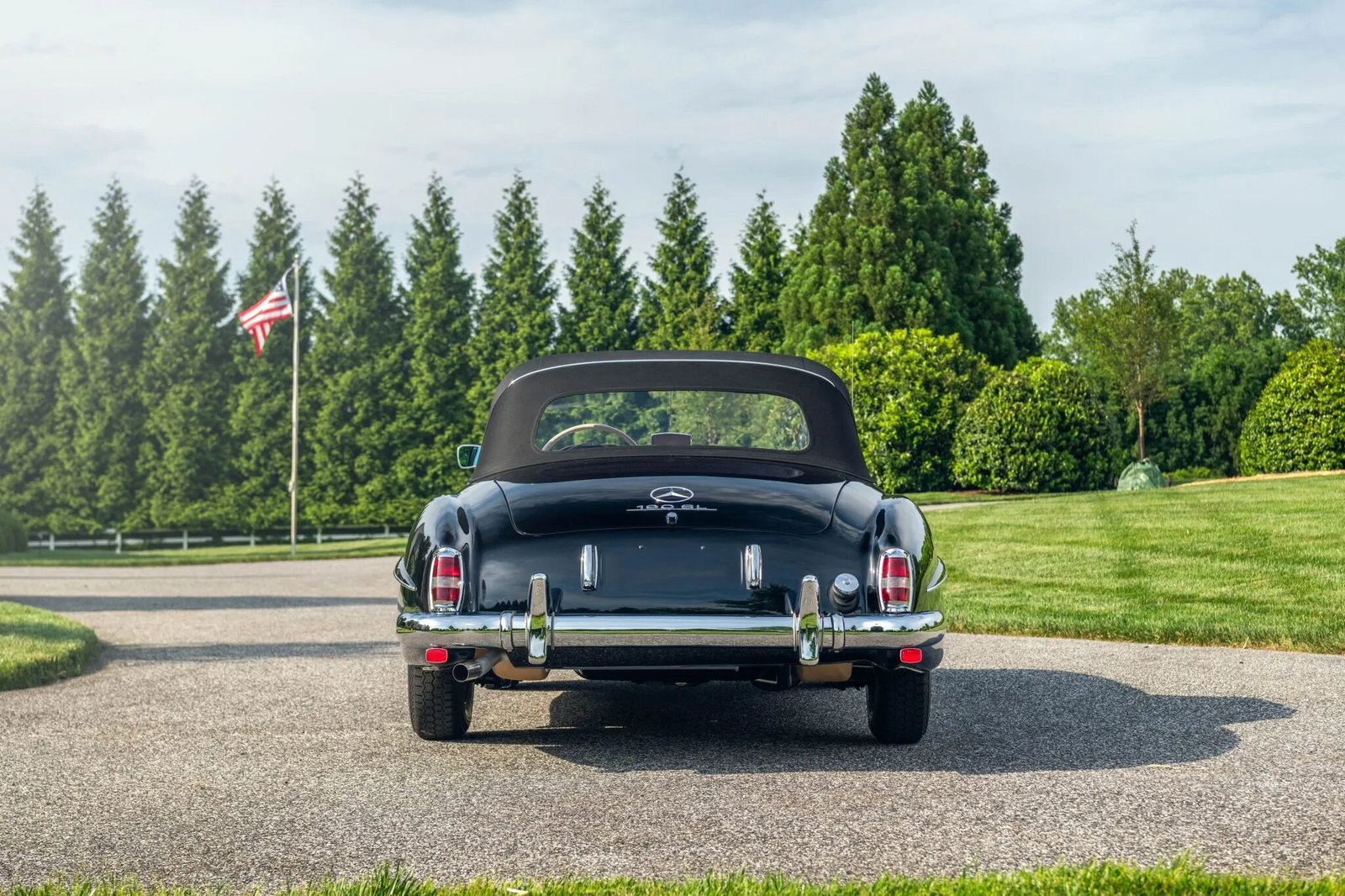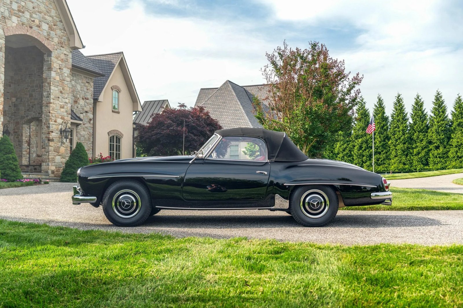 This 1956 Mercedes-Benz 190SL was restored by East Coast Restorations. The car is finished in black over red leather and powered by a 1.9-liter inline-four paired with a four-speed manual transmission. Equipment includes a black convertible top, 13″ steel wheels with body-color hubcaps, chrome bumpers with overriders, a Becker Europa radio, a dashboard-mounted rearview mirror, and bucket seats.