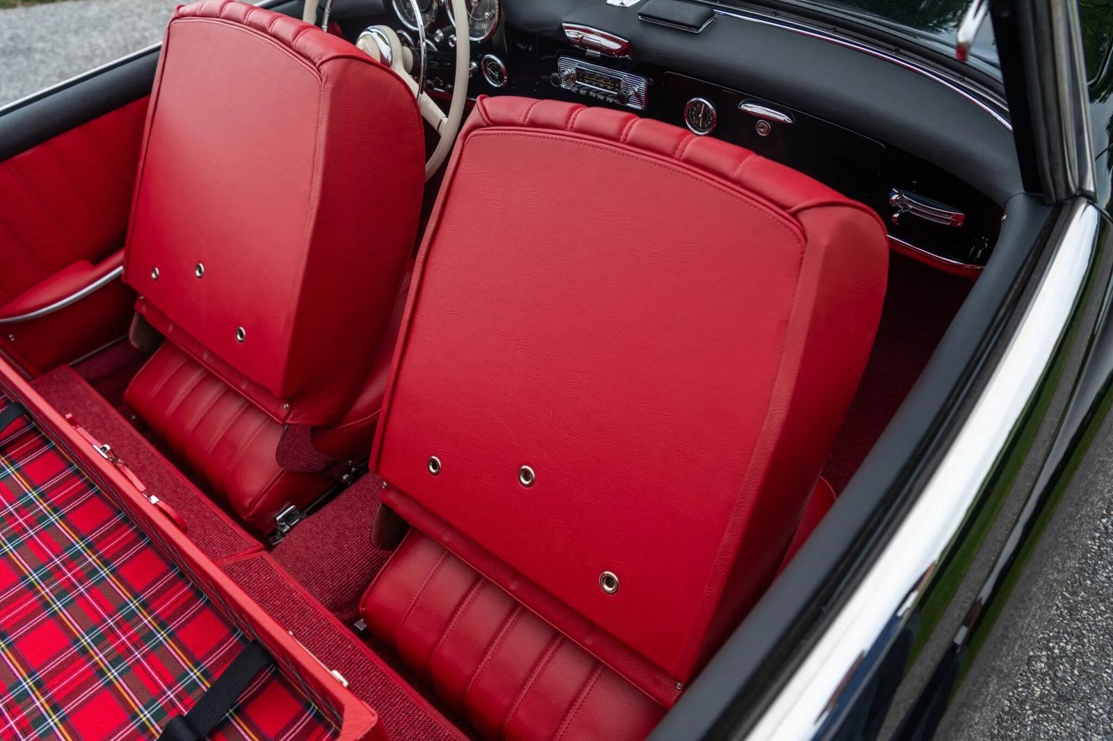 The cabin was reupholstered by the Eclectic Motor Company and features red leather bucket seats as well as matching door panels and contrasting black dashboard trim. Amenities include an analog clock, a heater, a dashboard-mounted rearview mirror, and a Becker Europa radio.