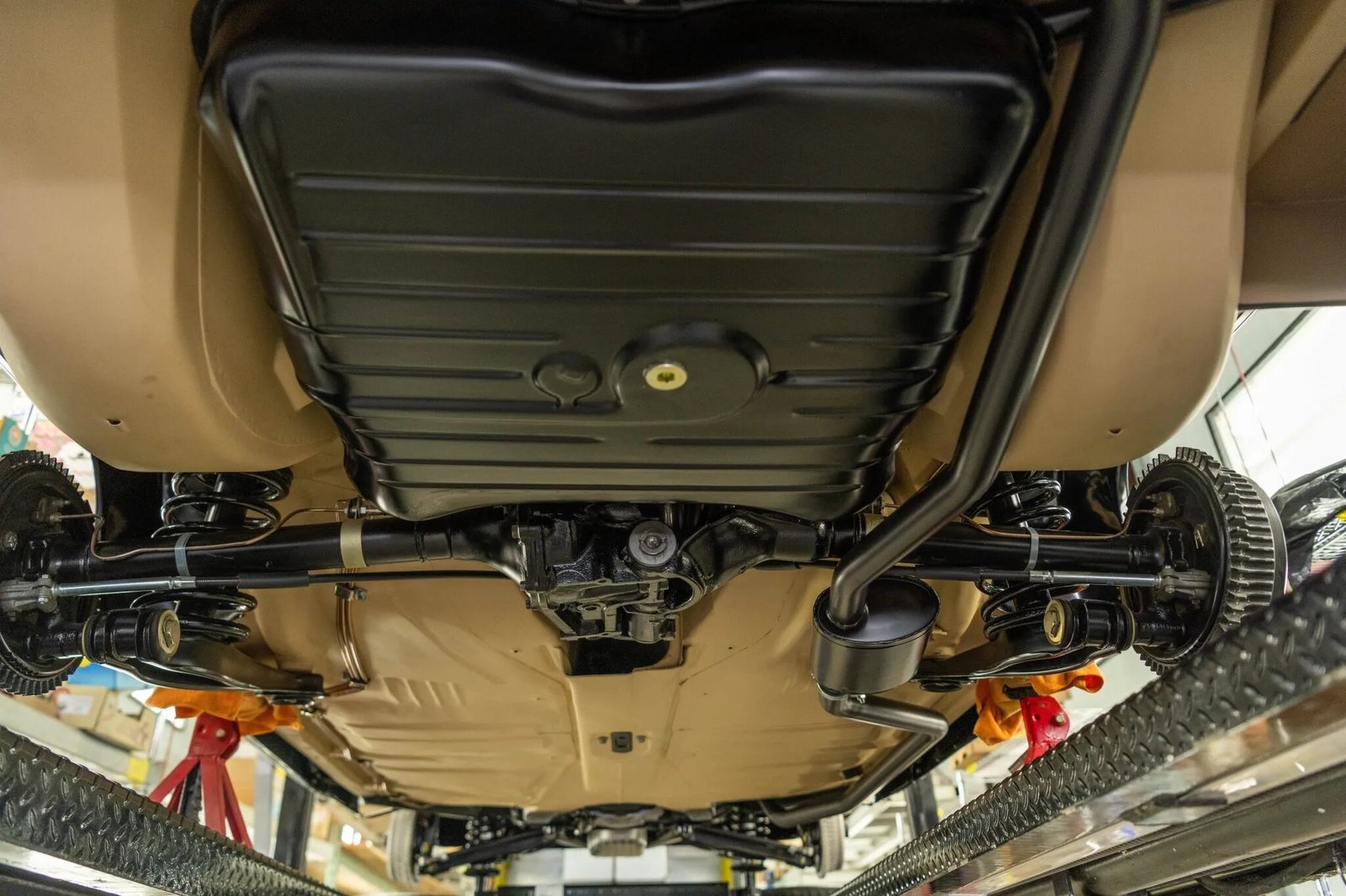 Steel 13″ wheels wear chrome trim rings, hubcaps with body-color accents, and Michelin Radial tires. The car is equipped with a double-wishbone front suspension, rear swing axles with coil springs, and power-assisted drum brakes.