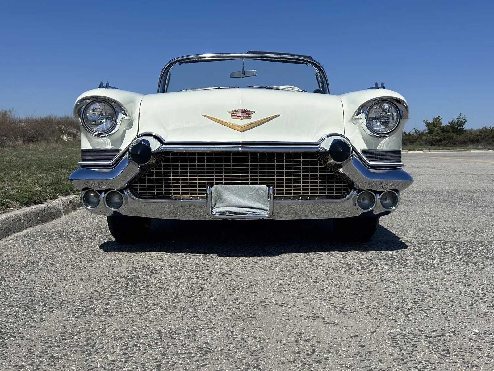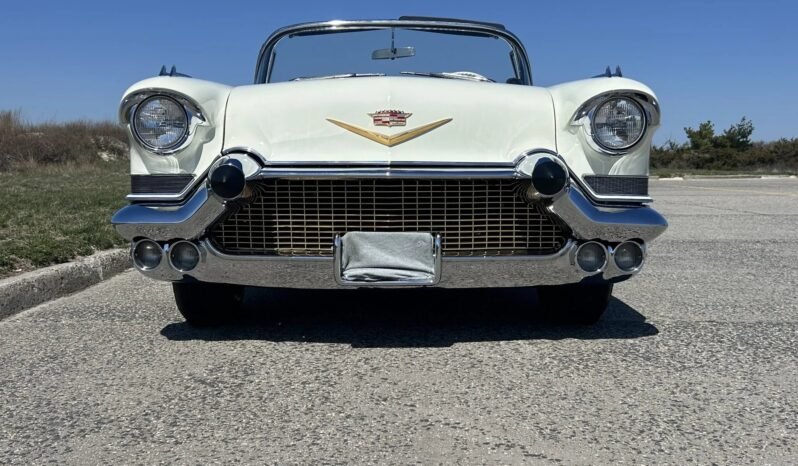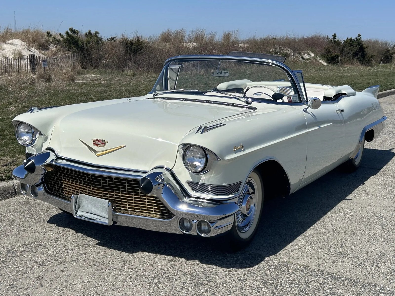 This 1957 Cadillac Eldorado Biarritz convertible is finished in white with a matching power-operated soft top over black and white leather upholstery, and power comes from a 365ci V8 paired with a four-speed automatic transmission. Equipment includes twin four-barrel carburetors, a gold-painted ‘batwing’ air cleaner, 15″ Sabre wheels, power-assisted brakes and steering, a power-operated white convertible top with a matching parade boot, power windows, air conditioning, a six-way power-adjustable front bench seat, an Autronic Eye headlight dimmer, a push-button AM radio, and a heater.