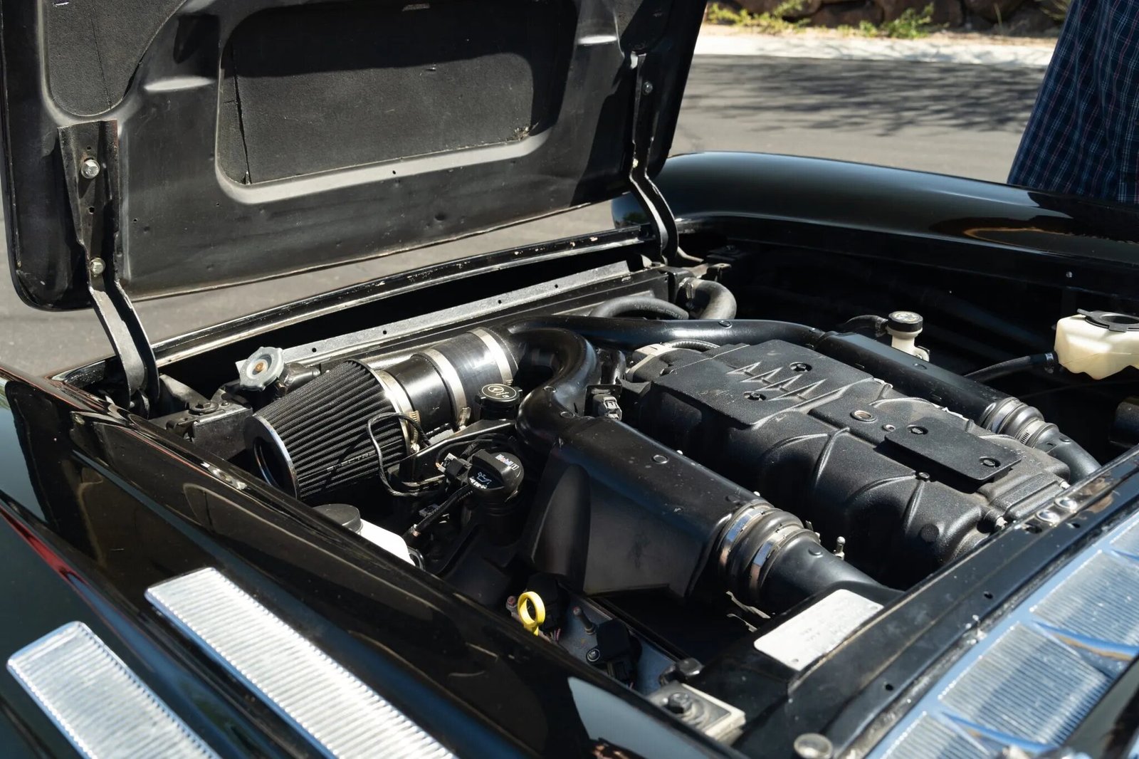 The supercharged and fuel-injected 4.4-liter Northstar V8 have been sourced from a Cadillac XLR-V. The power-steering gearbox and the battery were replaced. Power is sent to the rear wheels through a replacement six-speed automatic transmission that was sourced together with the replacement Northstar engine. A replacement fuel tank and exhaust system including pipes, mufflers, and resonators were fitted.