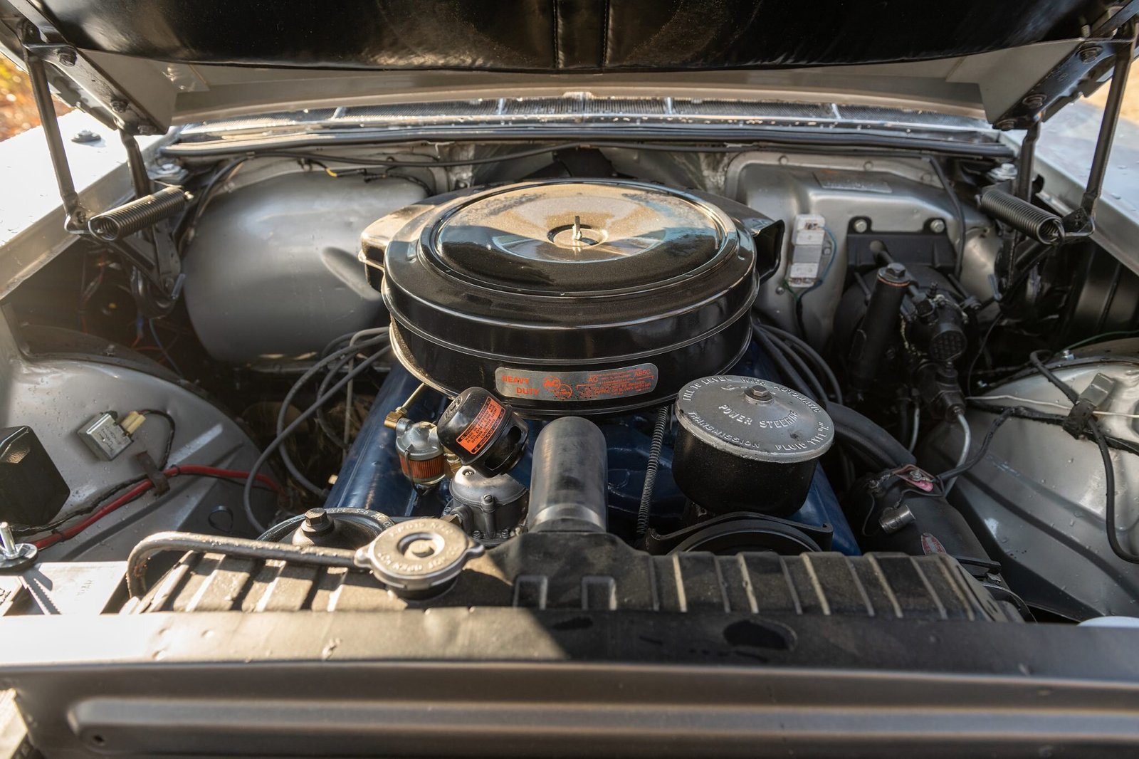 The silver-painted 15″ wheels wear chrome covers with color Cadillac center crests and are mounted with Coker Classic whitewall radial tires.