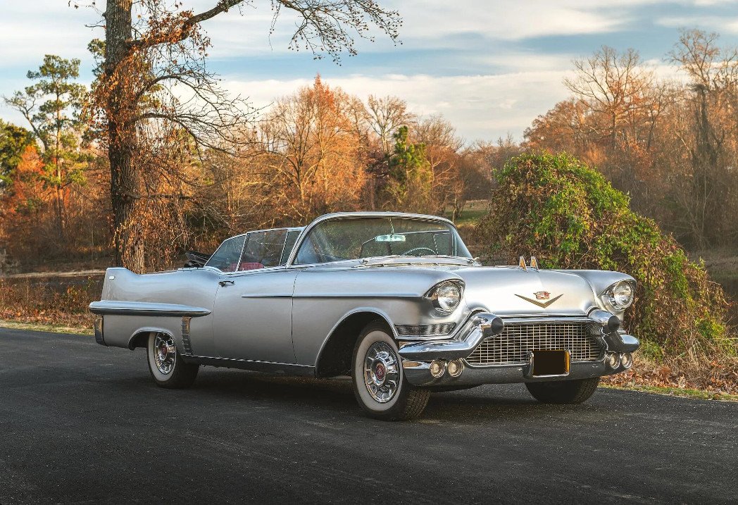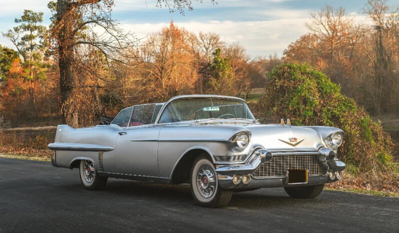 This 1957 Cadillac Series 62 convertible is finished in silver over red leather upholstery, and power comes from a 365ci V8 paired with a four-speed automatic transmission.