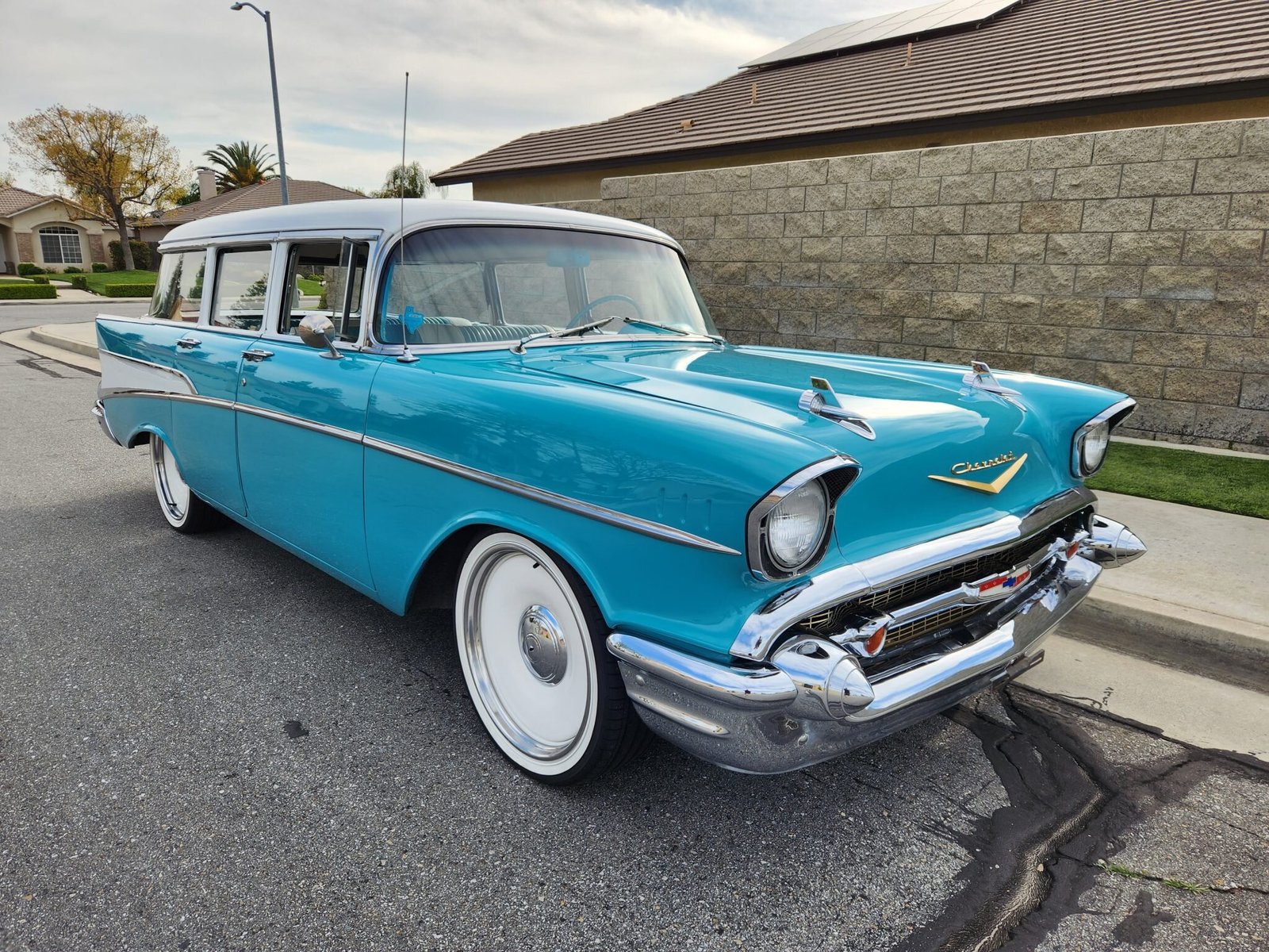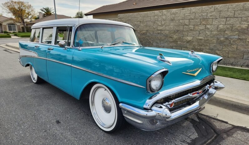 This 1957 Chevrolet 210 four-door station wagon is powered by a 350ci V8 mated to a 700R4 four-speed automatic transmission and is finished in turquoise and white over a matching interior. Equipment includes an Edelbrock intake manifold, a Carter AFB four-barrel carburetor, power front disc brakes, 20″ Detroit Steel Smoothie wheels, Aldan American adjustable front coilovers, air conditioning, and a Kenwood CD stereo.
