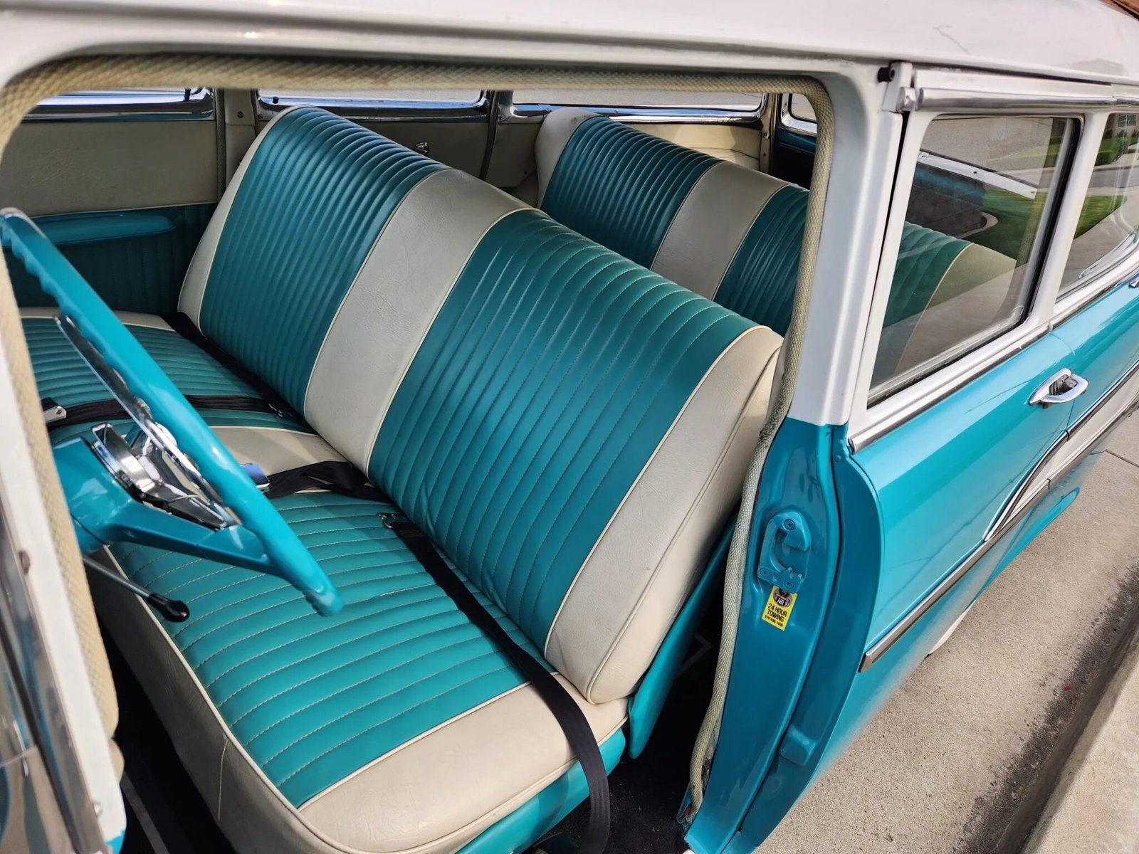 The front and rear bench seats were reupholstered in white vinyl with turquoise pleating, and the door panels are trimmed to match.